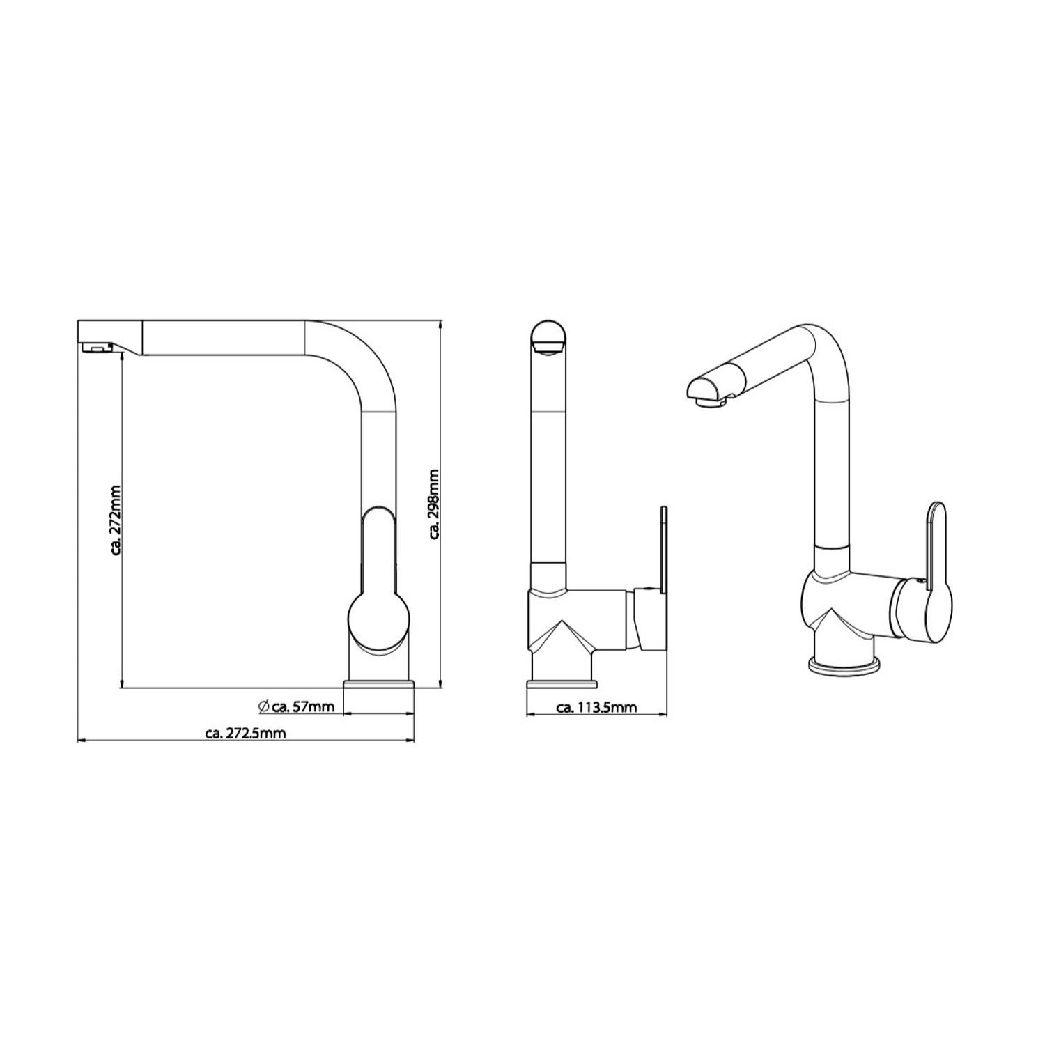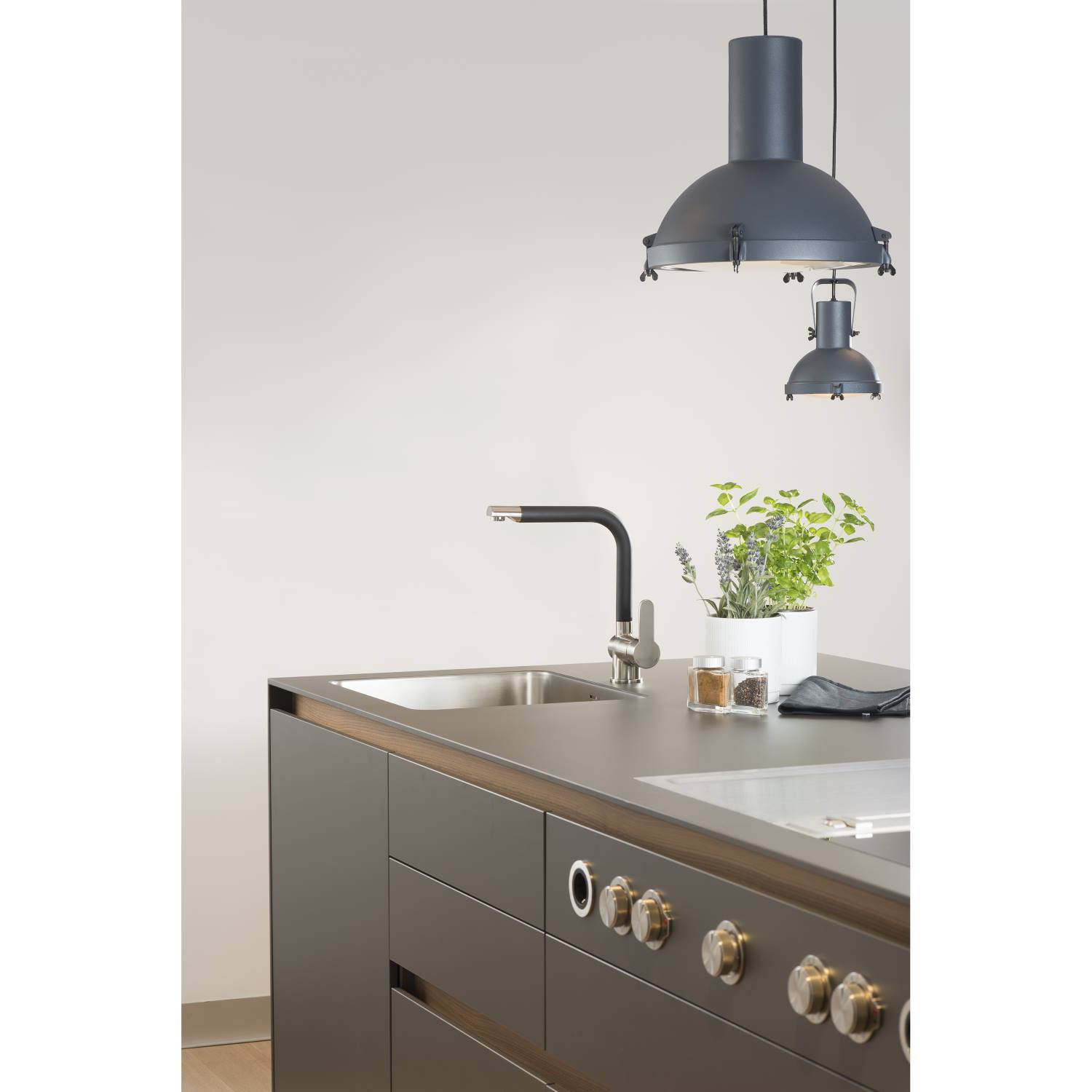 De Rio keukenkraan van het merk Schutte is gemaakt van metaal en heeft een mat zwarte en chromen afwerking. De mengkraan heeft een aparte uitstraling vanwege de L-vorm van de uitloop en de hoogte van de kraan. De keukenkraan is gemakkelijk te bedienen met een zijdelingse hendel. Met de hendel kunt u de temperatuur van het water regelen. De keukenkraan beschikt over een hoge en draaibare uitloop. De draaibare uitloop maakt het mogelijk om een dubbele vaat met water te vullen. De mengkraan is 27.3 cm lang, 29.8 cm hoog en het heeft een diameter van 5.7 cm.
