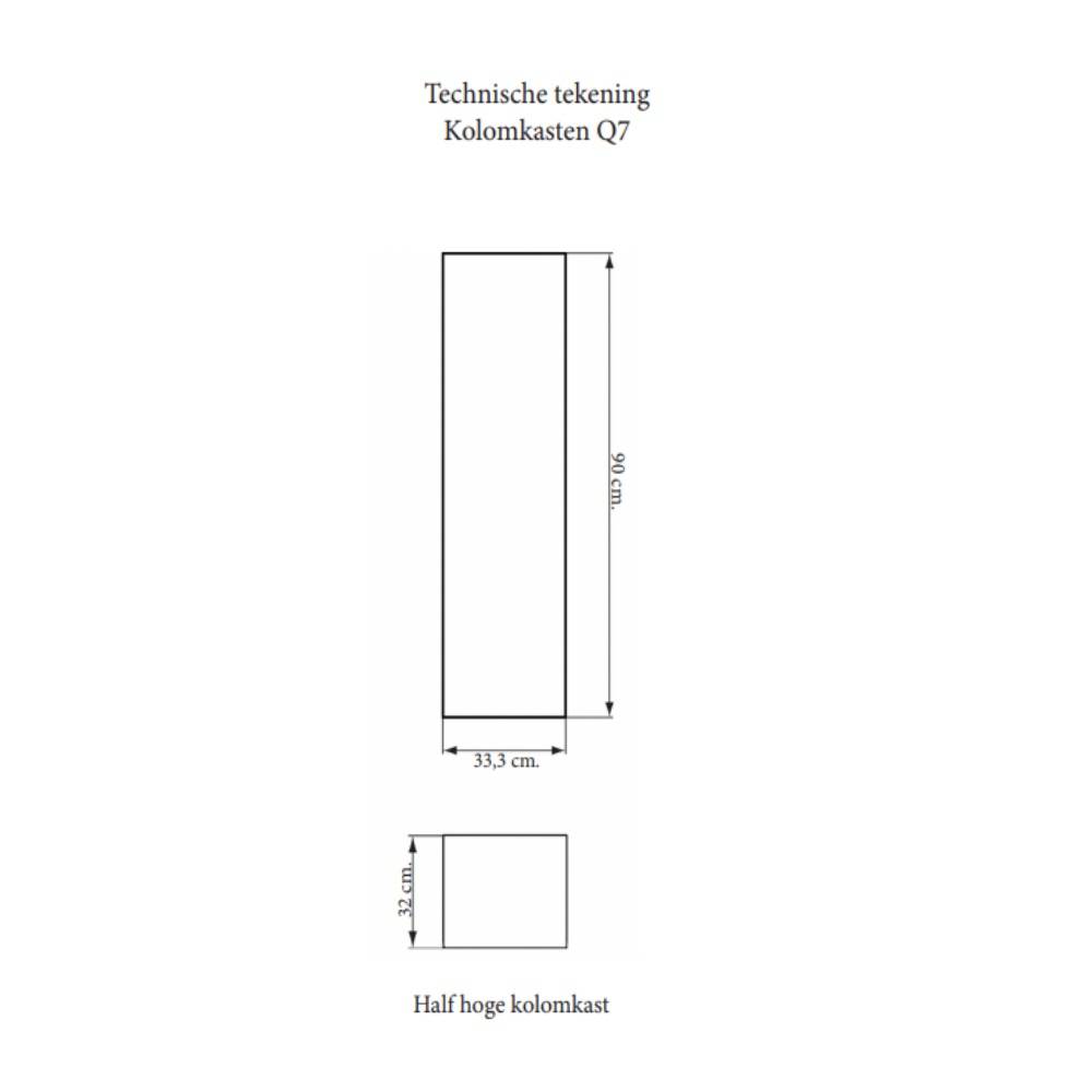 De kolomkast heeft een hoogte van 90 cm, een breedte van 33,5 cm en een diepte van 32 cm. De kast valt perfect te combineren met andere producten uit de Q15-serie van Sanicare. De kolomkast is afgewerkt in de kleur grey-wood.