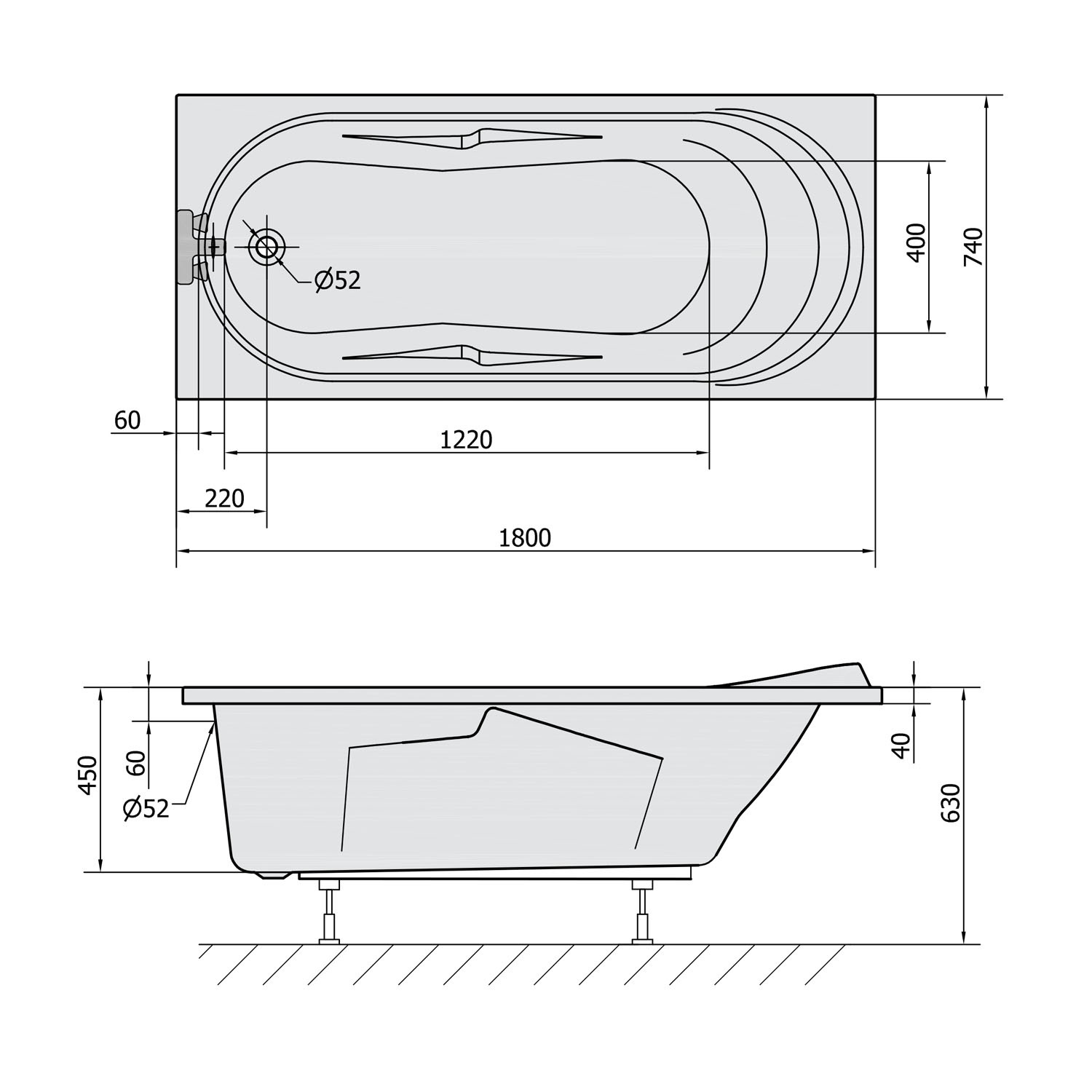 Het bad heeft een lengte van 180 cm, een breedte van 74 cm en een totale hoogte van 45 cm. Het bad wordt geleverd exclusief sifon, waste en badpoten. Deze kunt u eenvoudig mee bestellen.