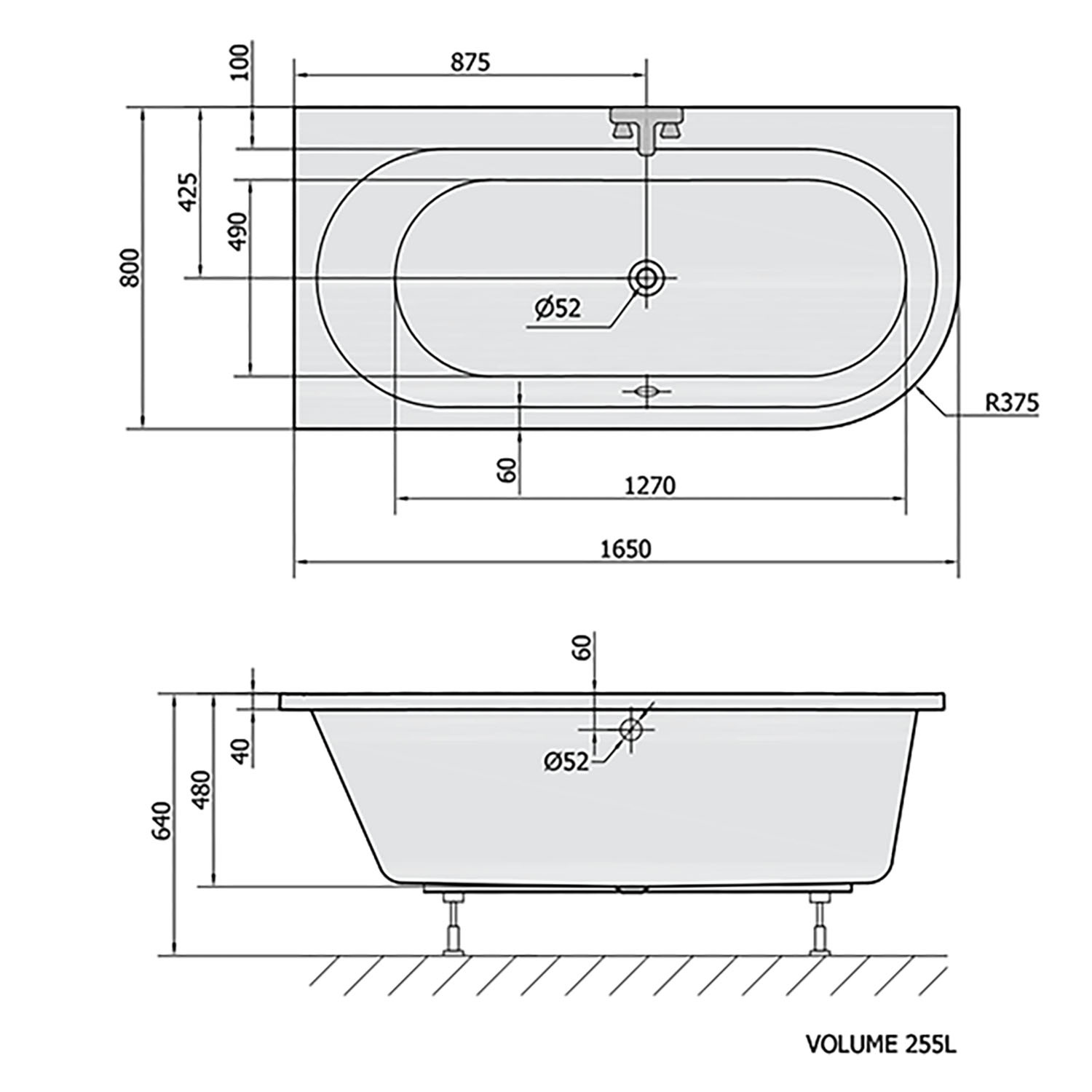 Het bad heeft een lengte van 165 cm, een breedte van 80 cm en een totale hoogte van 48 cm. Het bad wordt geleverd exclusief sifon, waste en badpoten. Het is van belang dat u een badafvoercombinatie bestelt met een minimum lengte van 77,5 cm.