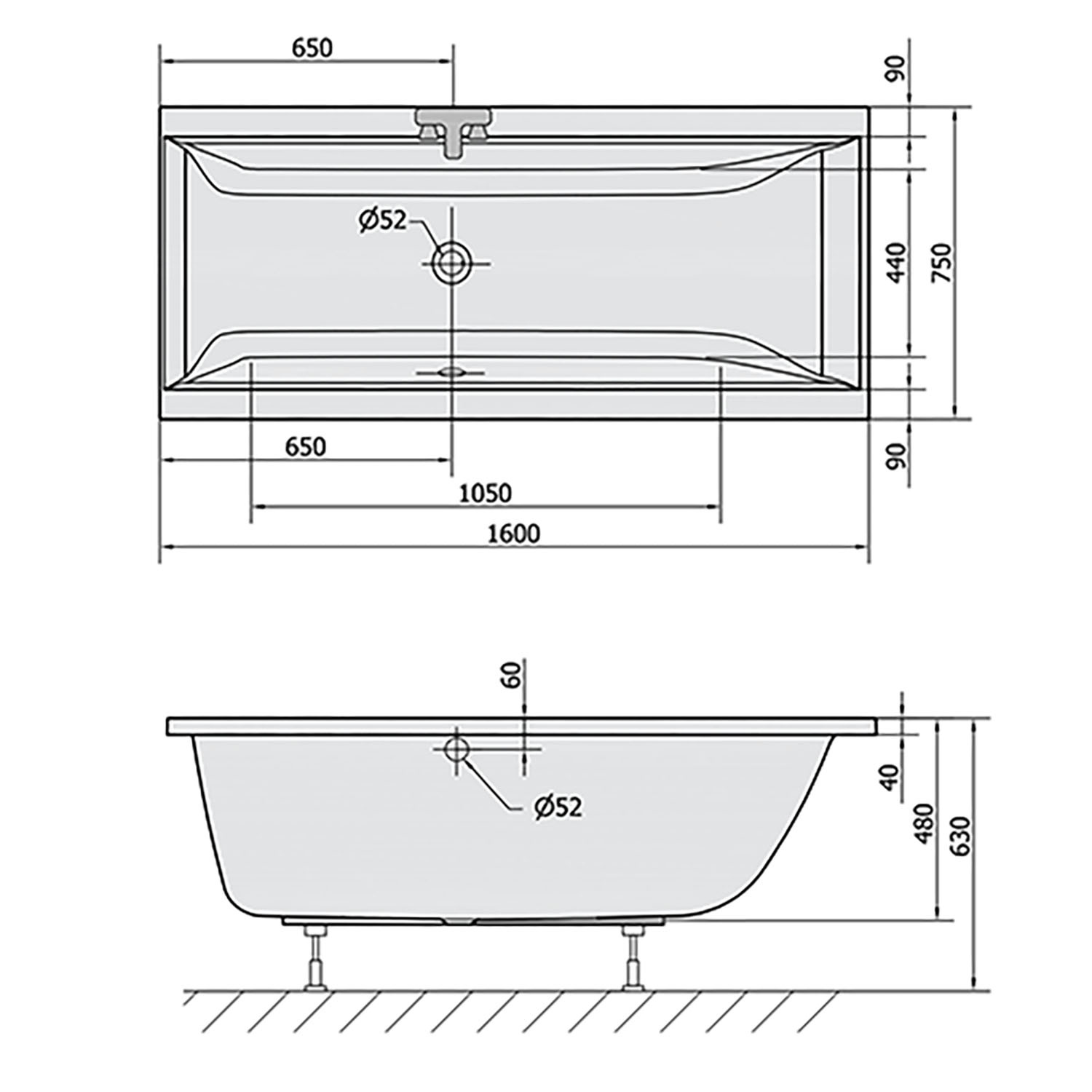 Het bad heeft een lengte van 160 cm, een breedte van 75 cm en een totale hoogte van 48 cm. Het bad wordt geleverd exclusief sifon, waste en badpoten.