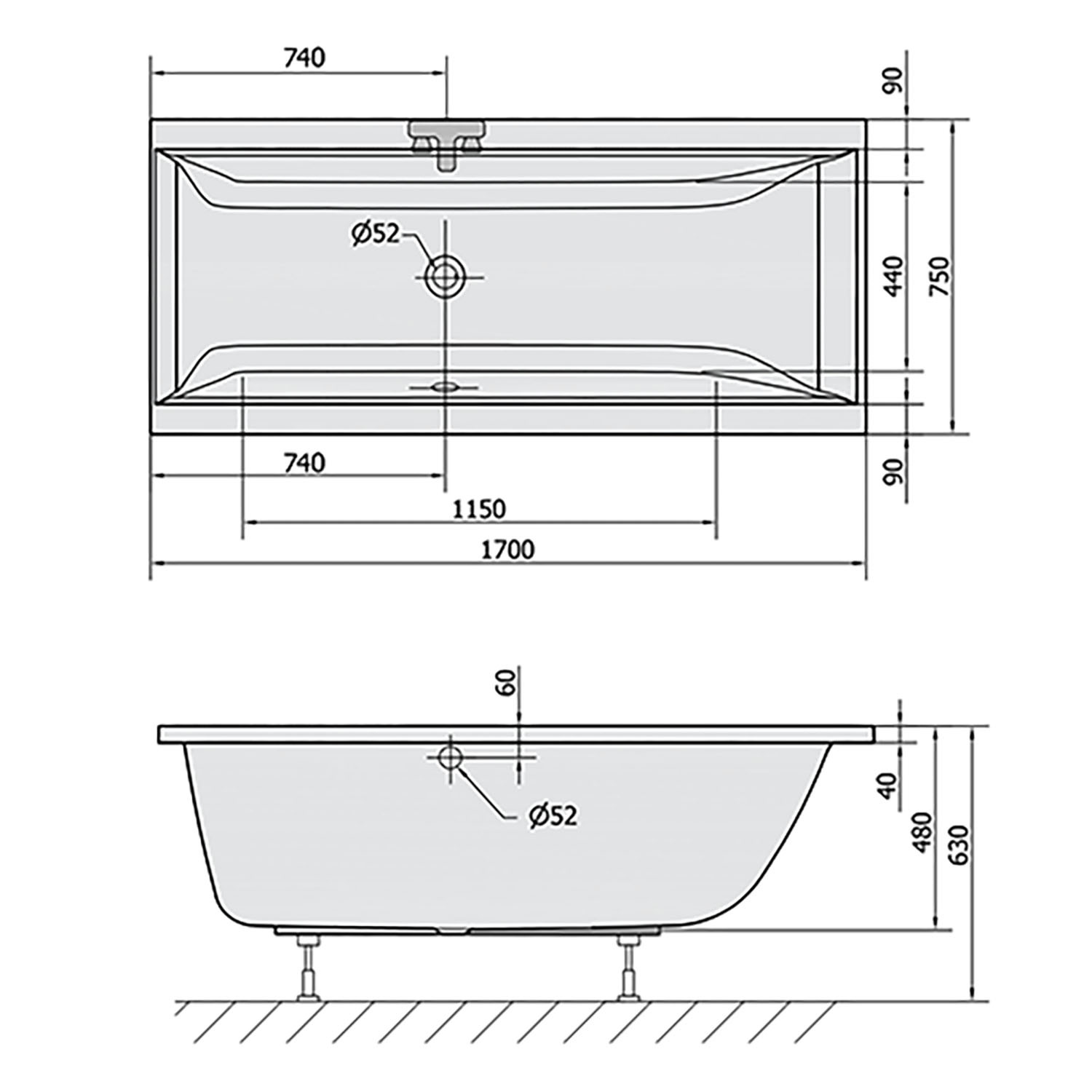 Het bad heeft een lengte van 170 cm, een breedte van 75 cm en een totale hoogte van 48 cm. Het bad wordt geleverd exclusief sifon, waste en badpoten.