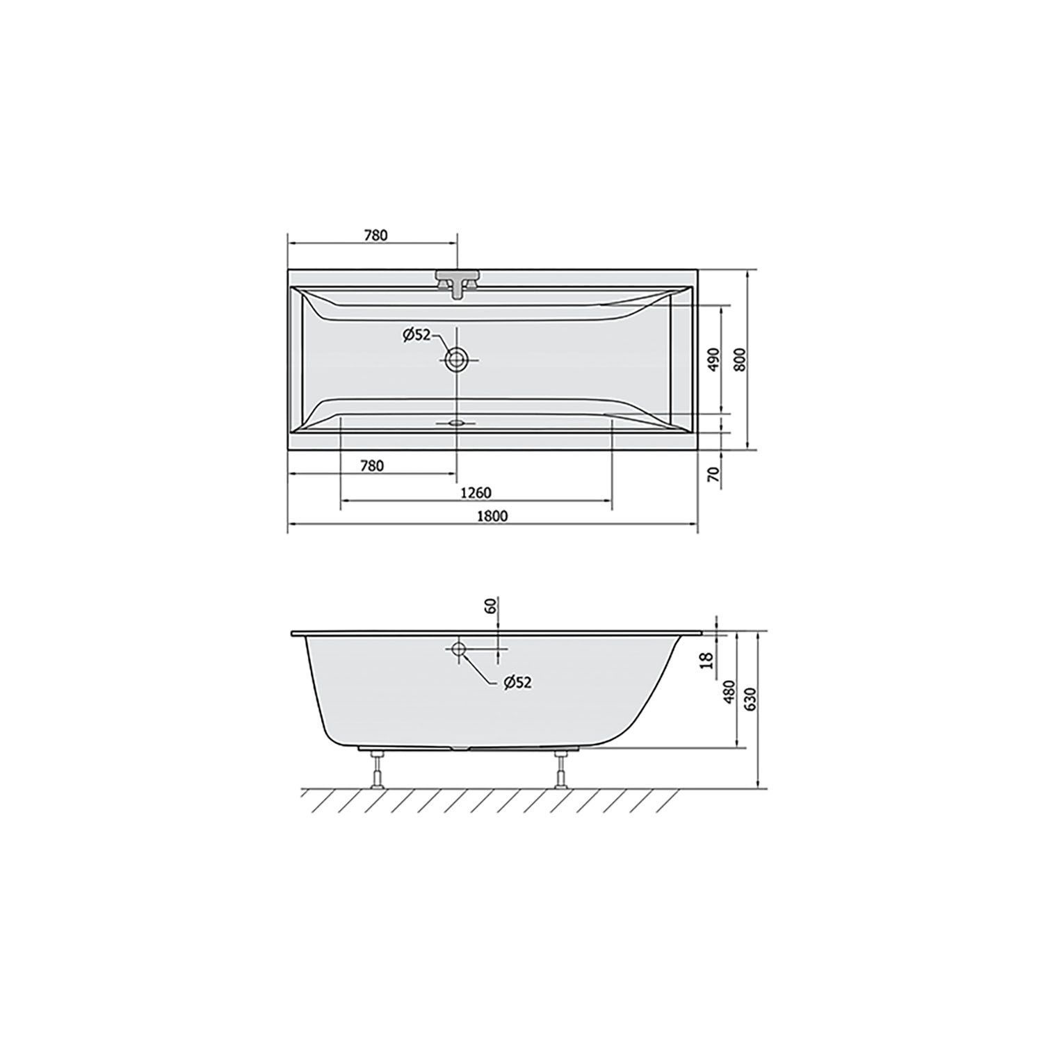 Het bad heeft een lengte van 180 cm, een breedte van 80 cm en een totale hoogte van 48 cm. Het bad wordt geleverd exclusief sifon, waste en badpoten.