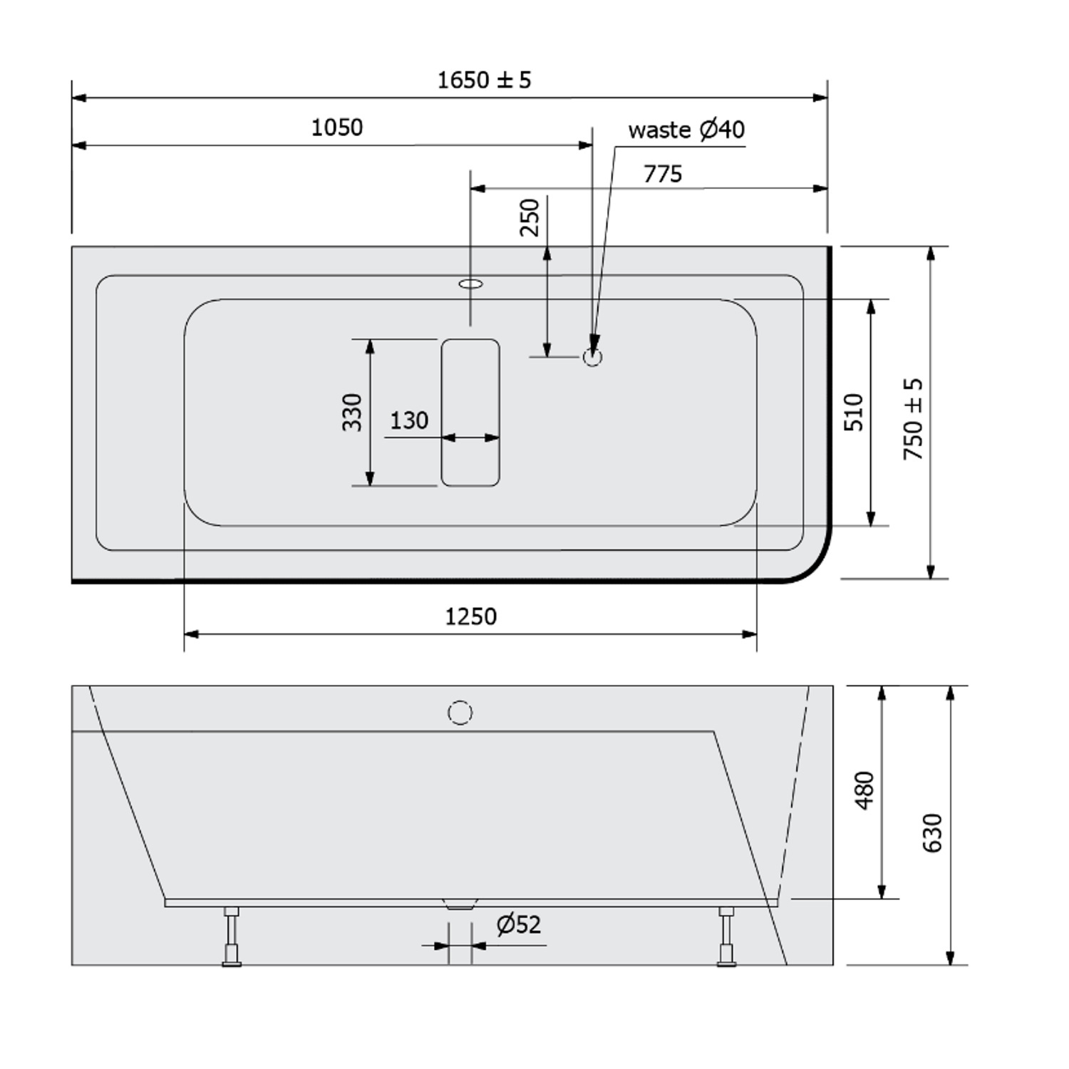 Het bad heeft een lengte van 165 cm, een breedte van 75 cm en een totale hoogte van 63 cm. De zitdiepte van het bad bedraagt 48 cm. Het bad wordt geleverd exclusief sifon en waste.