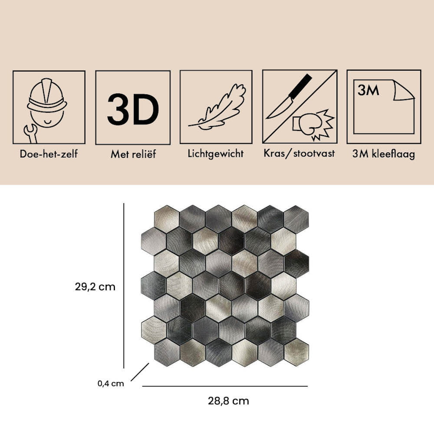 Geef uw ruimte gemakkelijk een nieuw uiterlijk met de zelfklevende mozaïek tegels van Isodeco. Deze tegelmatten hebben een afmeting van 29.0x28.0 cm en zijn 4 mm dik. De tegel bestaat uit hexagon steentjes met een steen en metallic uiterlijk. De tegelmatjes bevatten wit marmer en gouden tinten en zijn geschikt voor op de wand.