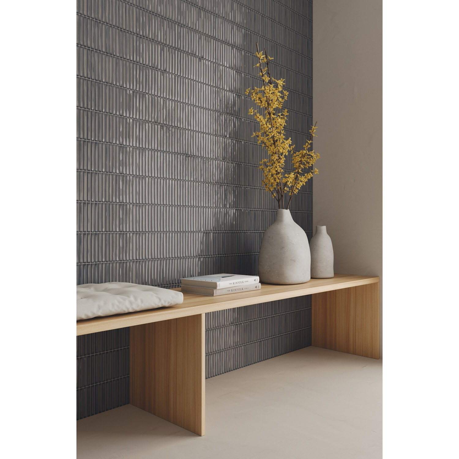 Deze mozaïek is van het merk Stardos en komt uit de serie Bars. De mozaïek is gemaakt van keramiek en heeft een grijze kleur. De afmeting van deze tegel is 12.5 cm hoog met een breedte van 25 cm en een dikte van 9 mm. De tegel is niet door en door gekleurd, alleen de bovenste laag heeft een kleur. De randen van deze tegels zijn gerectificeerd en hierdoor strak tegen elkaar aan te plaatsen.
