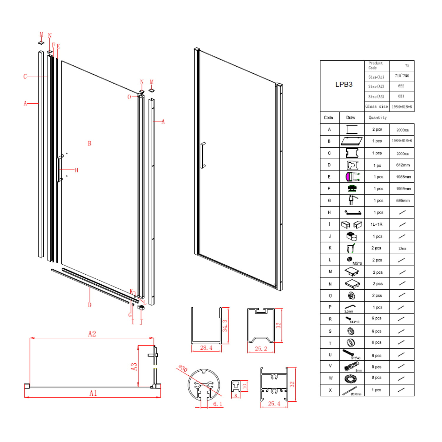 De afmetingen van de wand zijn 200 cm hoog en 75 cm breed. Daarnaast is de daadwerkelijke instapbreedte van de douche 61 cm. Deze nisdeur heeft een minimale maat van 71 cm en is door middel van het profiel uitbreidbaar tot 75 cm.