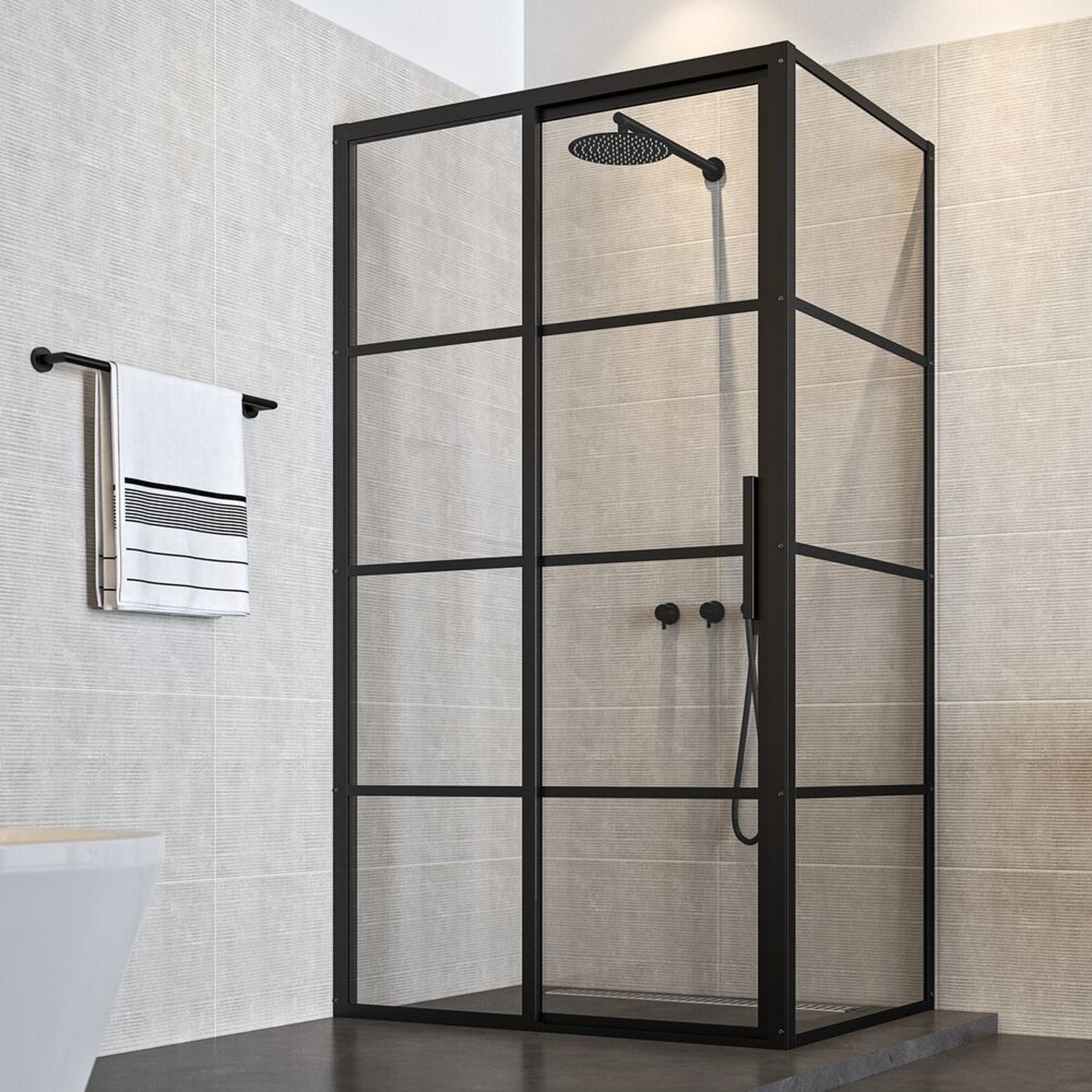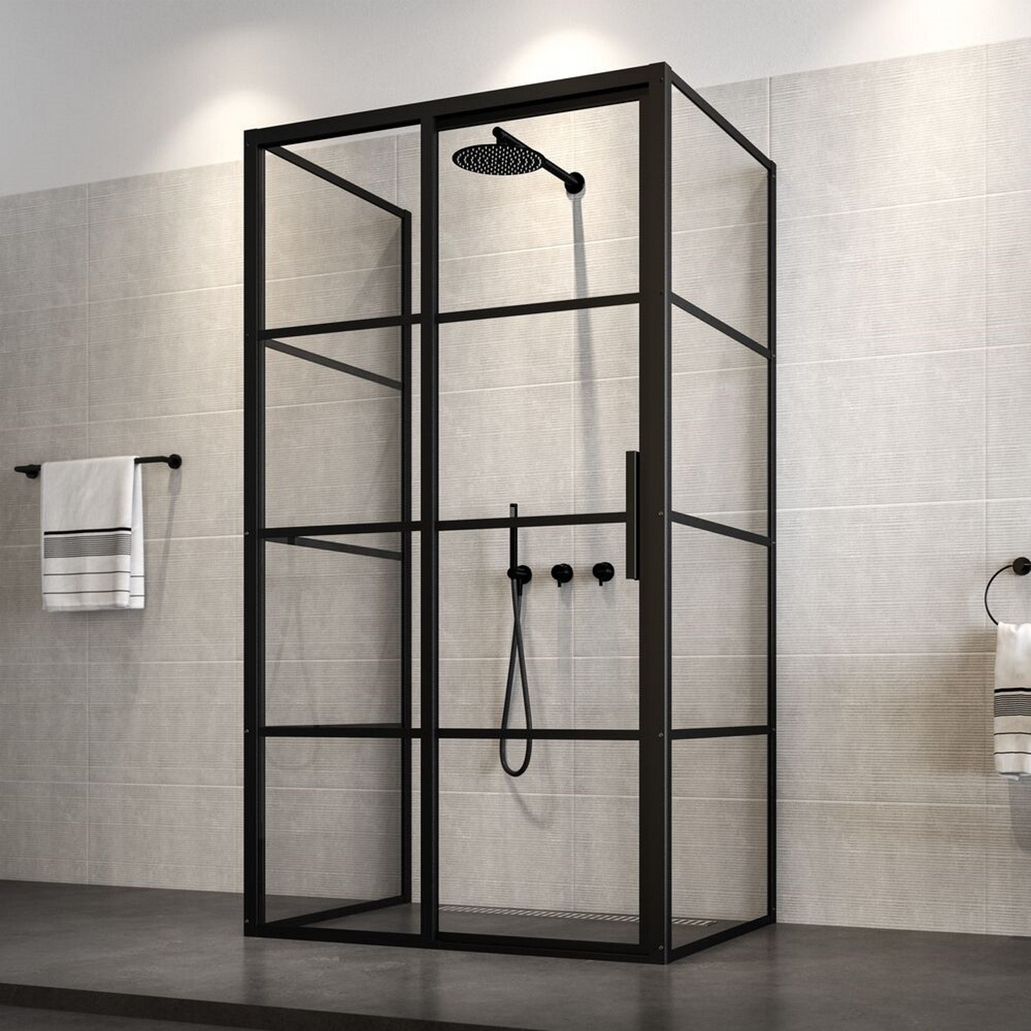 Moderne deuren met een duidelijke knipoog naar de rauwe inspiratie. De zwarte metalen frames zijn gebaseerd op industriële deuren. Nu natuurlijk alleen aan de buitenzijde toegepast, zodat de douche van binnen eenvoudig te onderhouden is. Maar ook de subtiel toegepaste zichtbare bouten zijn een knipoog naar de oorsprong.