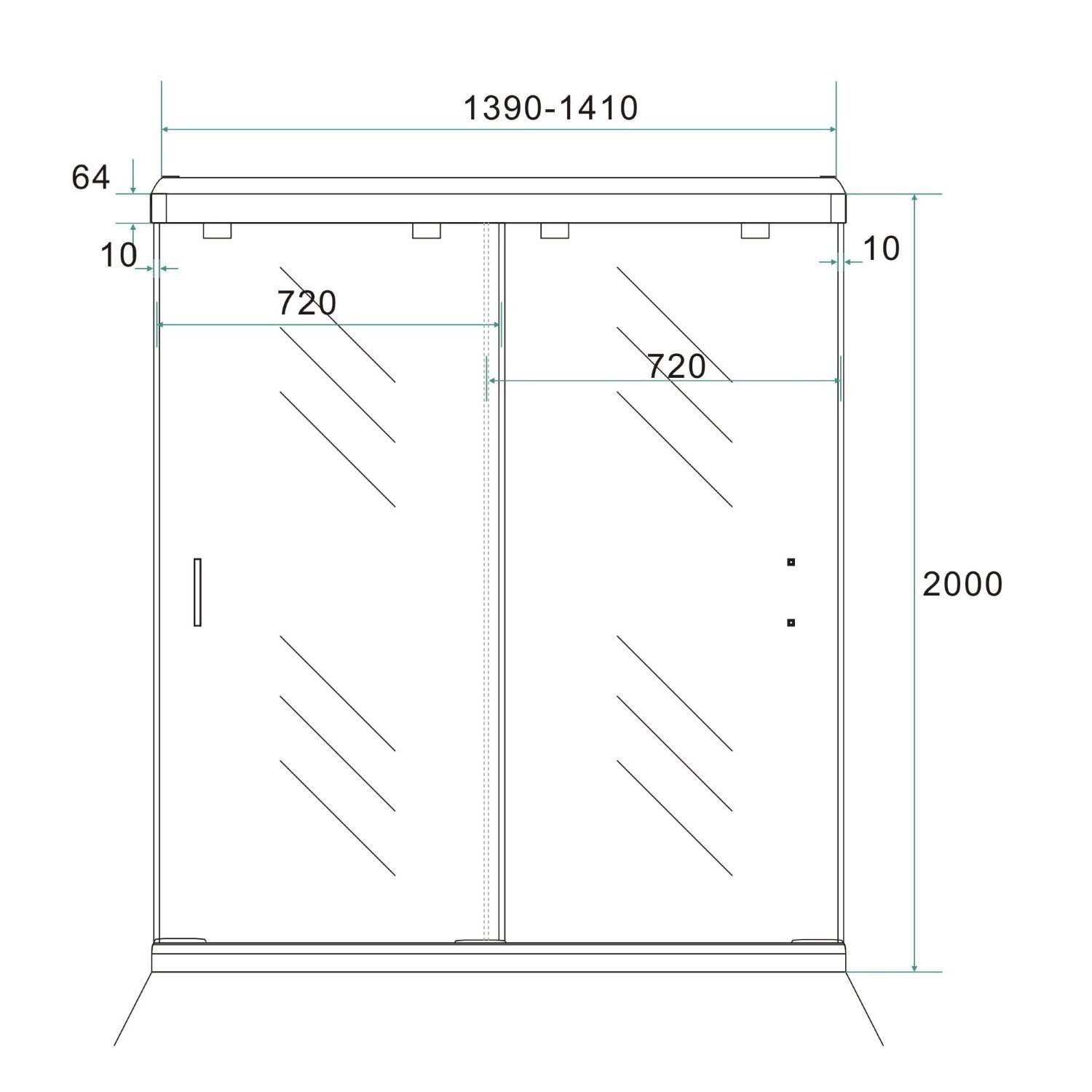 De douchedeuren hebben elk een breedte van 72 cm en een hoogte van 200 cm. De deuren zijn samen, naast elkaar, 142 cm breed. Het heldere glas kent een dikte van 8 mm en is voorzien van NANO Coating veiligheidsglas.
