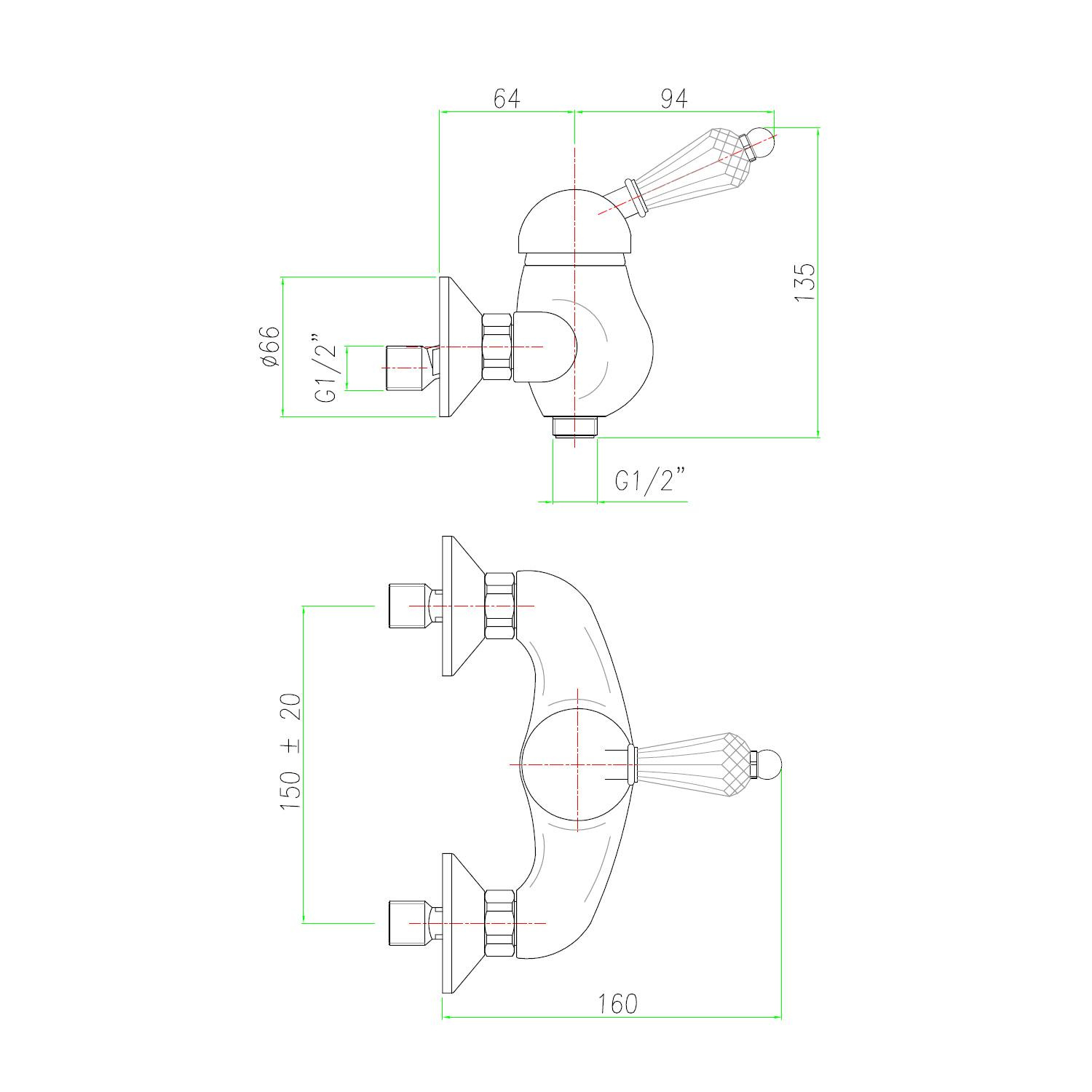 De twee kranen voor warm en koud water zijn hier vervangen door een mechaniek waarin de doorstroming van het koude en warme water met een kristal hefboom wordt bedient. Door de hendel aan de bovenkant horizontaal te bewegen reguleert u de verandering van de temperatuur van het water terwijl de verticale beweging de stroomsnelheid bepaalt. Omlaag om de kraan te sluiten, omhoog om hem te openen.