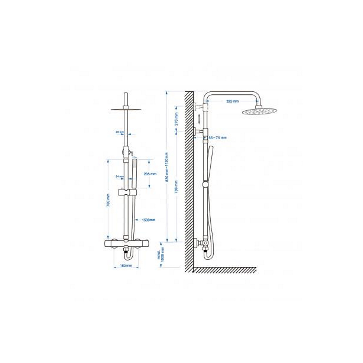 De set is in lengte breed verstelbaar van 83 cm tot 113 cm. Daarnaast is het belangrijk dat de set minimaal 100 cm boven de grond gemonteerd wordt. Ook is de afstand van de glijstang naar de muur verstelbaar van 5.5 tot 7.5 cm.