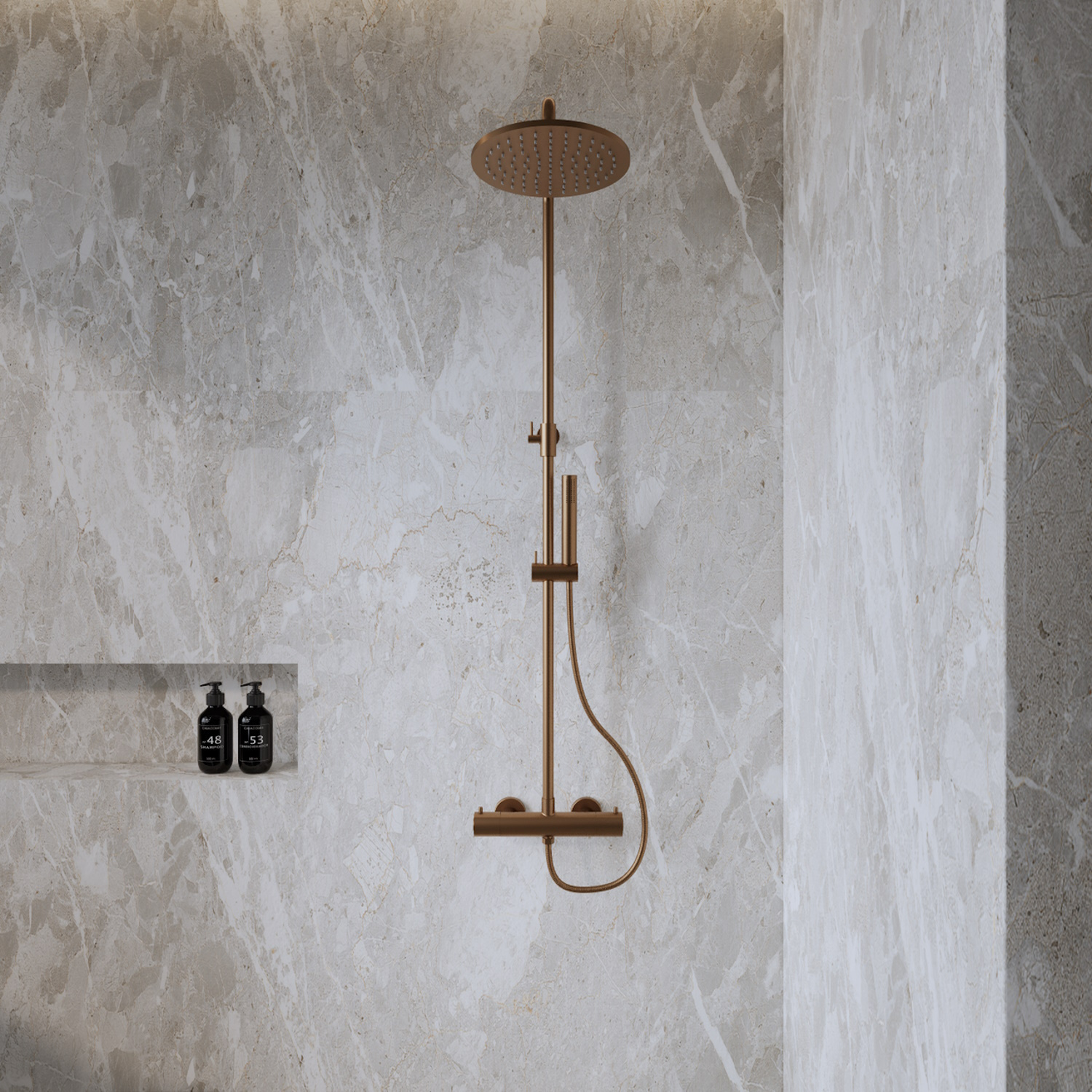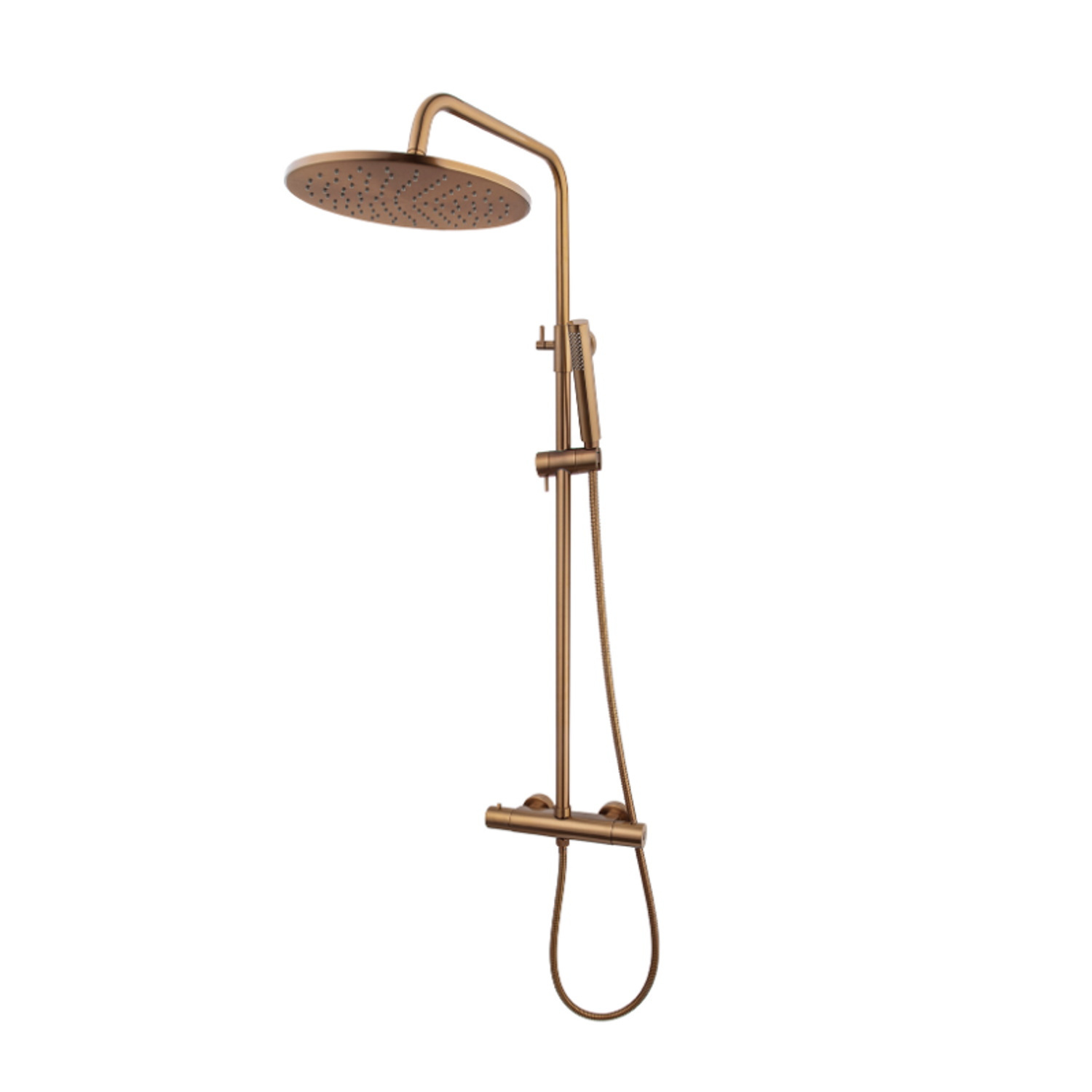 Uit de serie Danielle van BWS komt deze fraaie opbouw thermostatische rengendoucheset. Het geborsteld brons in combinatie met de koperen kleur geven deze regendoucheset een chique uitstraling. In deze regendoucheset zit een glijstang met uitloop, een thermostatische kraan, een handdoucheset en een ronde hooffddocuhe van 25 cm.