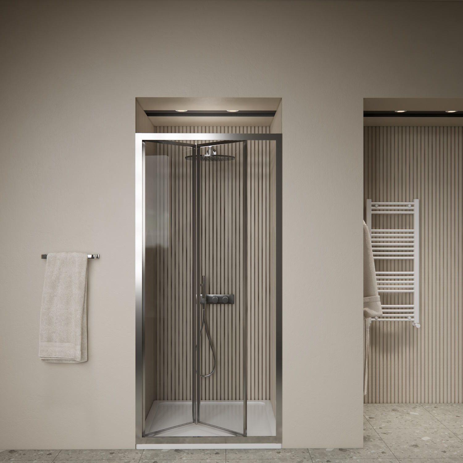 De nisdeur heeft een breedte van 70 cm en een hoogte van 190 cm. De deur heeft een chroom profiel.