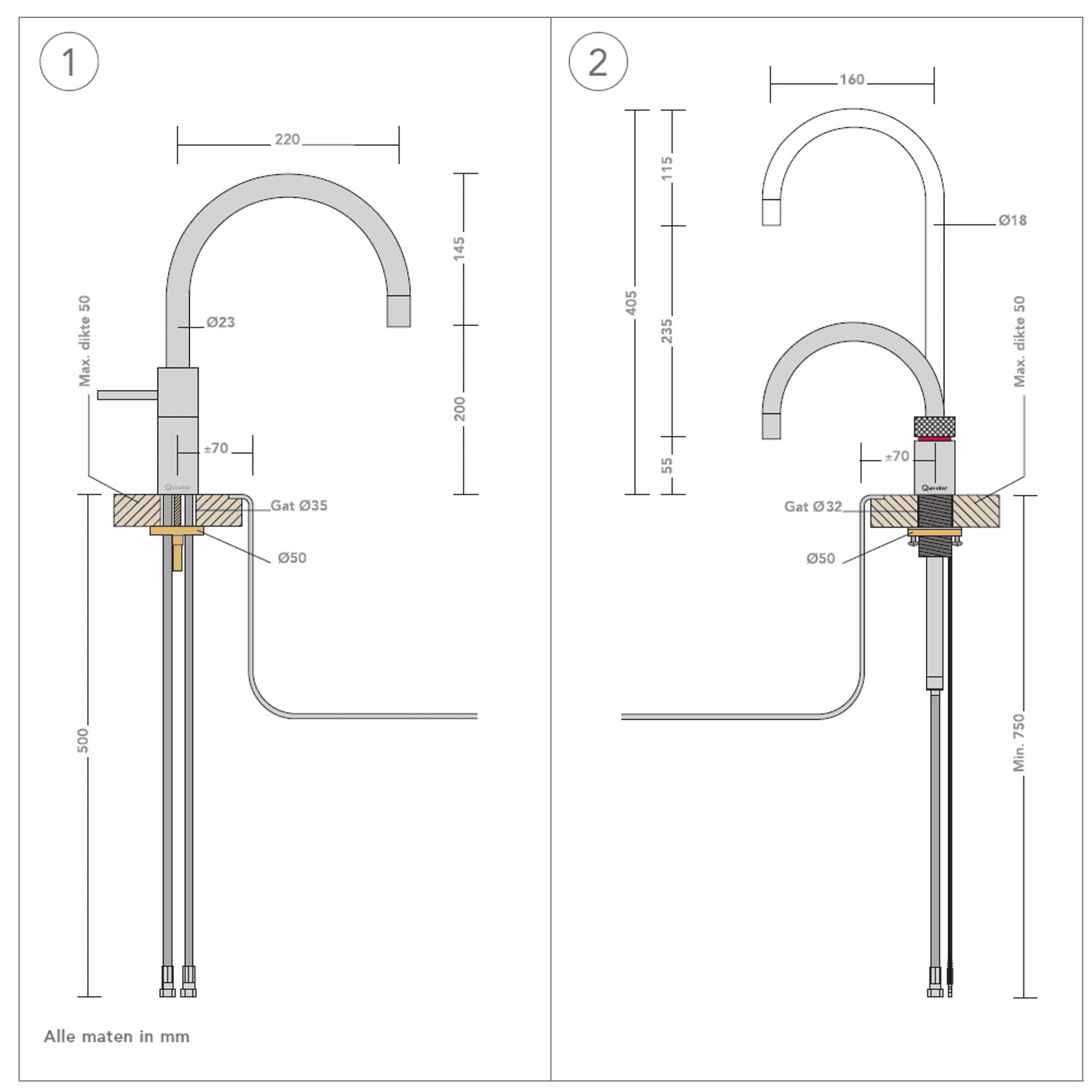 Bij de Combi alleen een koudwaterleiding. Het vervolg hiervan is dat u beperkt bent in het gebruik van warm water. Omdat dit uit de Quooker boiler moet komen. Het voordeel is dat er alleen een koudwaterleiding nodig heeft.