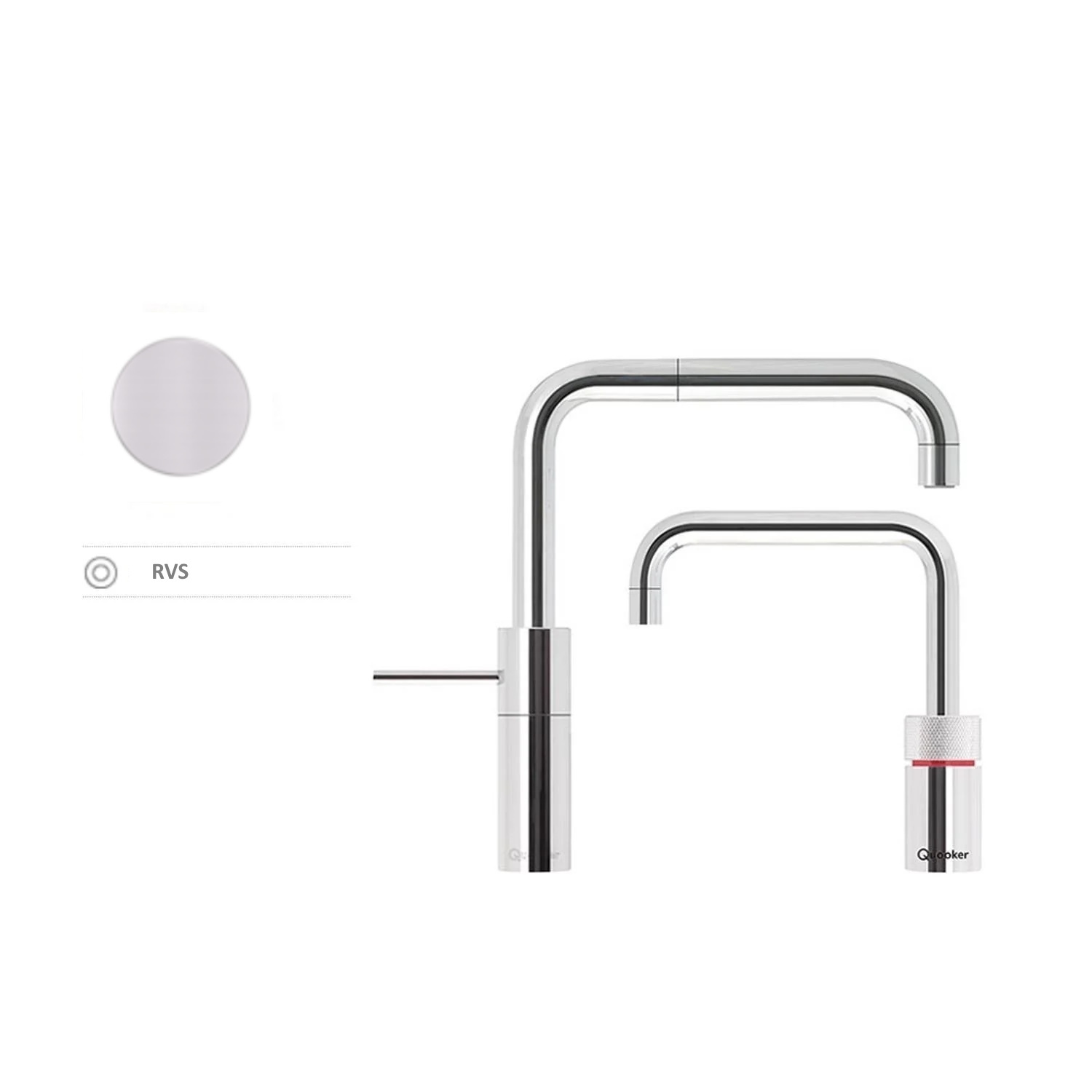 De Nordic Square Twintaps is een set kranen bestaande uit een kokendwaterkraan en een mengkraan in hetzelfde design met een ronde uitloop. De kokendwaterkraan bevat een dubbelwandige uitloop, zodat deze niet te heet wordt om vast te pakken. U drukt de ring twee keer naar beneden met een kwartslag draai. U ziet de rode lichtring oplichten. Hieraan kunt u zien dat de kokendwater tap geactiveerd is.