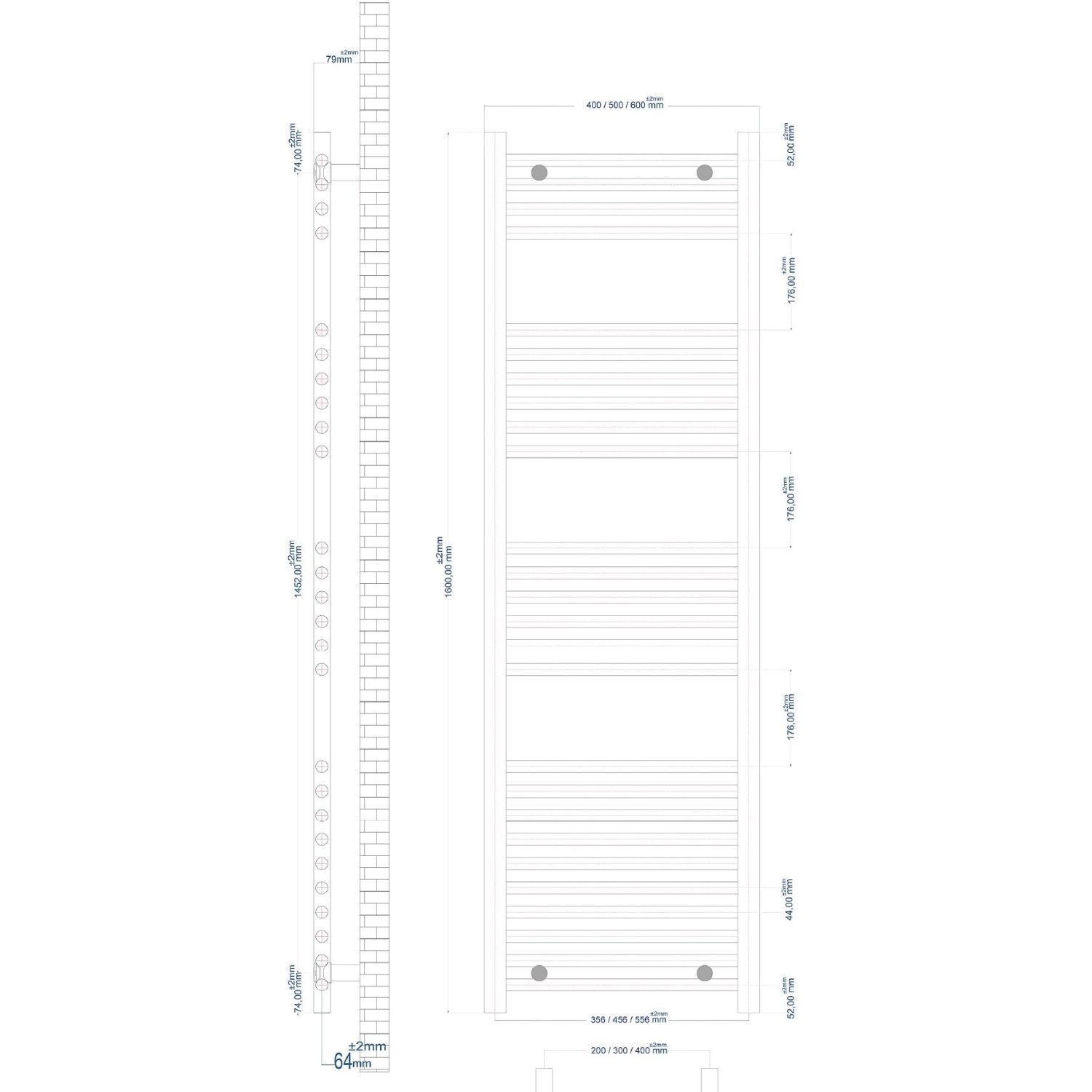 Dit model is verkrijgbaar in lengtes van 80 cm, 100 cm, 120 cm, 150 cm, 160 cm en 1160 cm. Daarnaast is deze radiator verkrijgbaar in breedtes van 40 cm, 50 cm en 60 cm. Dus hoe dan ook is er een geschikt model voor uw badkamer. Let goed op dat u de juiste radiator besteld voor de grootte van uw badkamer. Zie de afbeeldingen voor meer uitleg over hoe u dit kan berekenen.