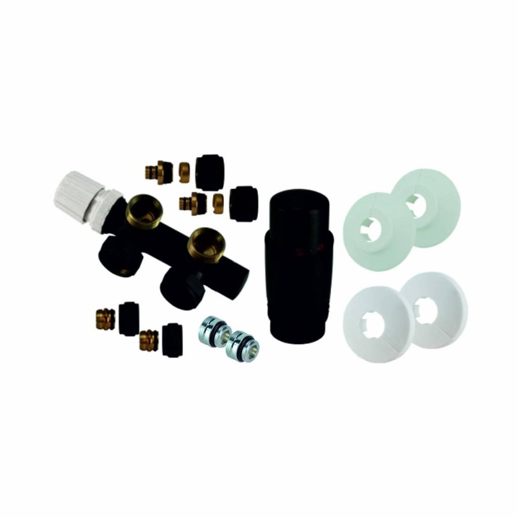 Het metaal is Mat Zwart en is bruikbaar voor alle designradiatoren met middenaansluiting. De uitvoering van de aansluitset is haaks links en hierdoor is het gemakkelijk te bevestigen direct in de muur.