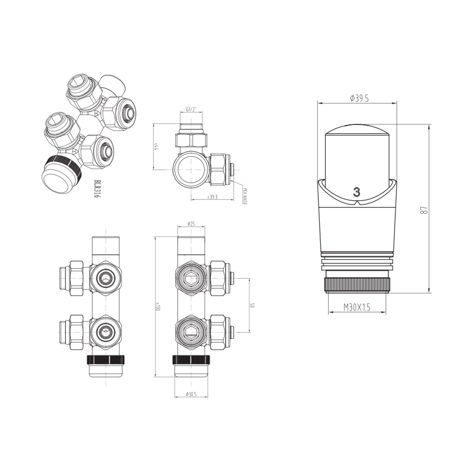 De set komt met een haaks onderblok, een thermostaat knop en twee verloopringen met een schroefdraad van 3/4 inch naar 1/2 inch.