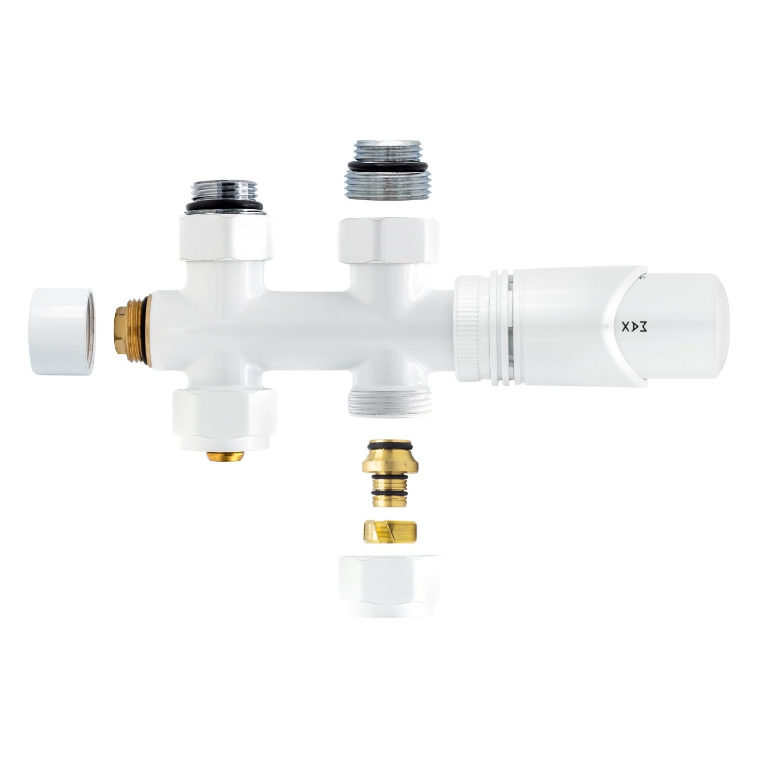 De set komt met een recht onderblok, een thermostaat knop en twee verloopringen met een schroefdraad van 3/4 inch naar 1/2 inch.