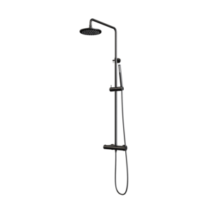De mat zwarte complete regendouche set is voorzien van een thermostatische mengkraan, douchekop met een doorsnee van 20cm, verstelbare muurbuis, S-koppelingen en rozetten.