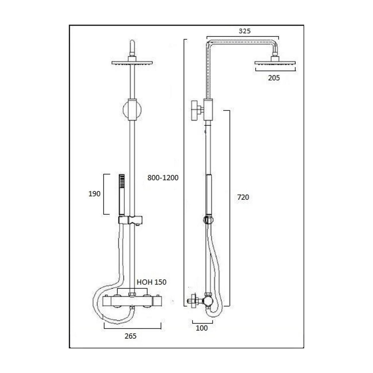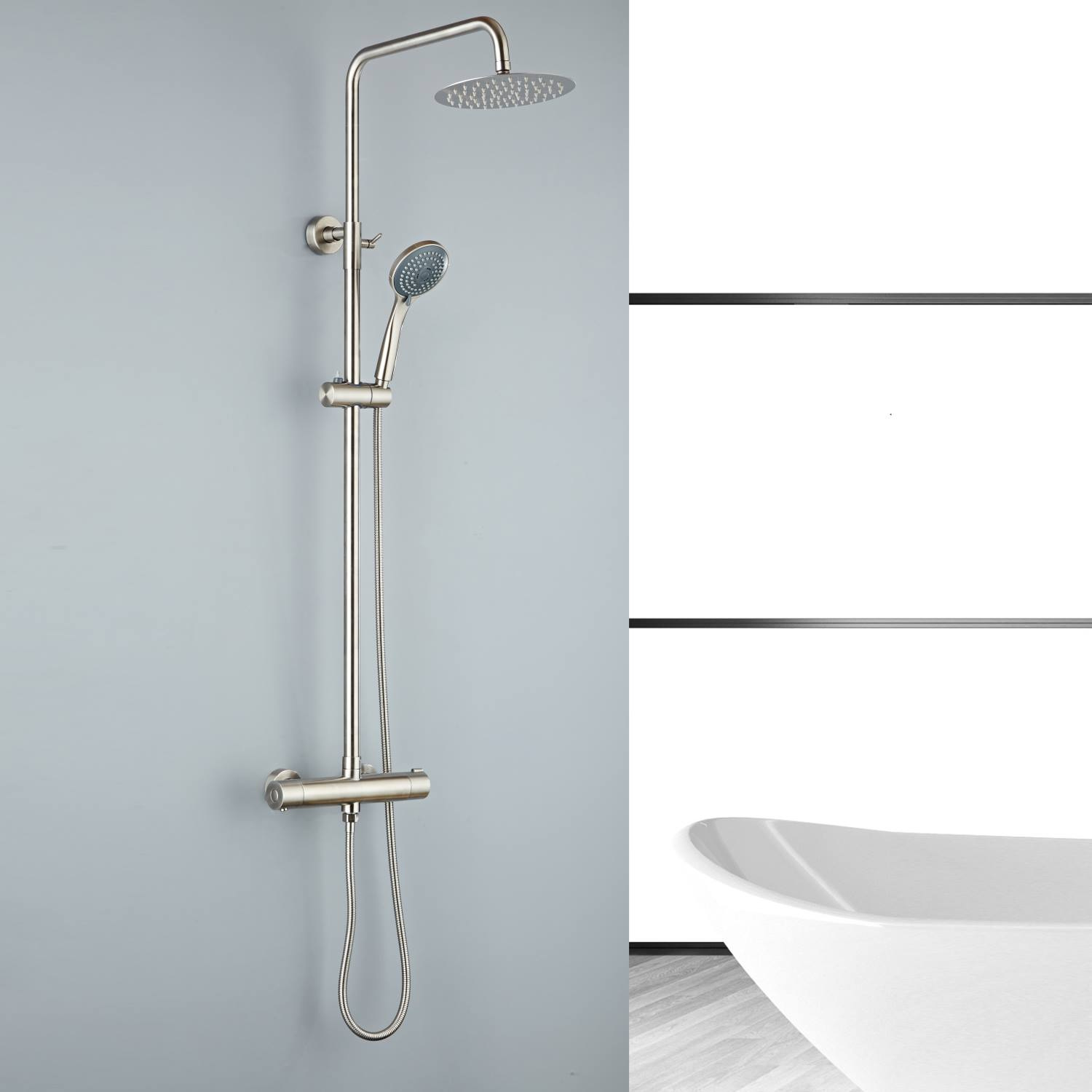 De regendouche is gemaakt van 304-RVS, ook wel roestvrij staal genoemd. De hoofddouche, de staafhanddouche, de thermostaatkraan, de doucheslang, de knoppen en de glijstang zijn allemaal gemaakt van volledig RVS. De 3 standen handdouche is gemaakt van kunststof. RVS is een zeer hoogwaardig materiaal en bij uitstek geschikt voor natte ruimtes. De thermostaatkraan is voorzien van keramische schijven wat zorgt voor soepele bewegingen en een lange levensduur. De set wordt compleet met s-koppelingen geleverd. De kraan aansluitmaat is 15cm hart op hart.