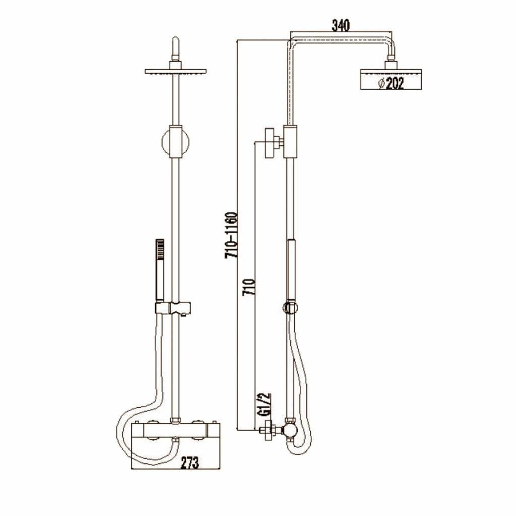 De stortdouche is voorzien van een thermostatische mengkraan. Aan de ene zijde van de kraan wordt de temperatuur geregeld. Hier zit een beveiligde functie op 38 graden. Aan de andere zijde bepaald u welke functie aan moet en hoe hard de straal mag zijn. Draait u de knop naar achter, gaat de hoofddouche aan. Draait u de knop naar voren, dan gaat de handdouche aan.