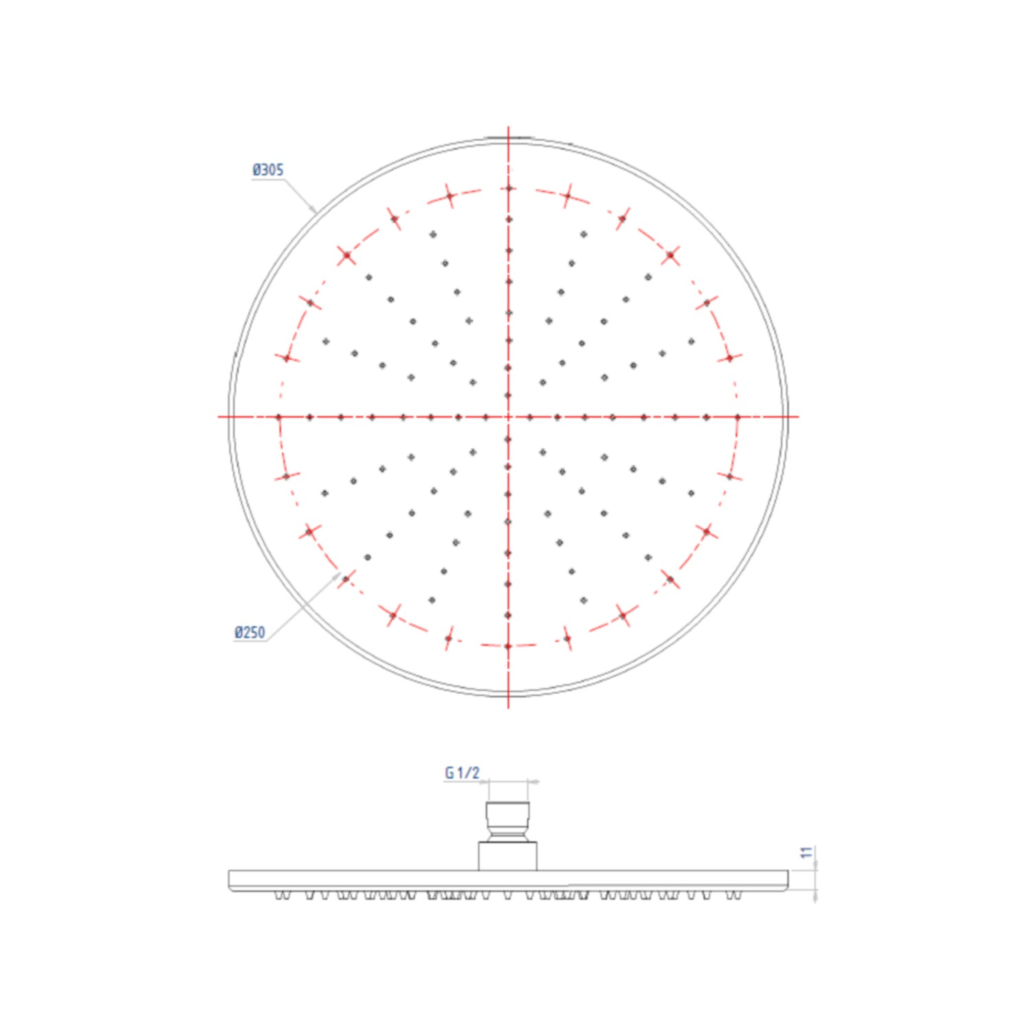 De douchekop heeft een diameter van maar liefst 30.5 cm. De spuitgaten strekken over een oppervlakte van 25 cm in diameter. De kop is 1.1 cm dik.