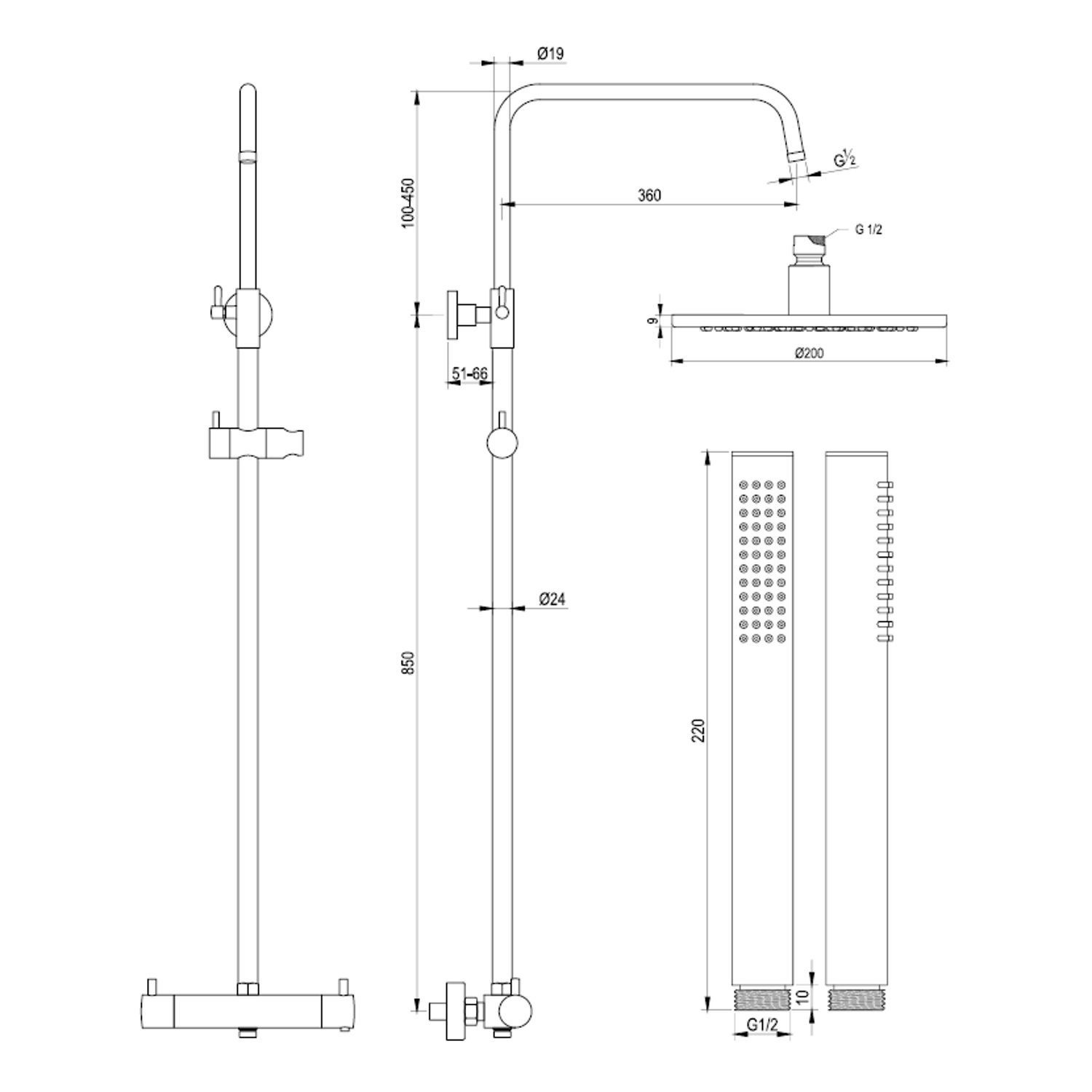 Deze set bestaat uit een complete opbouw regendoucheset met thermostaatkraan, staaf handdouche en regendouche van 20 cm. De thermostaatkraan is eenvoudig te bedienen. Met de linkerdraaiknop bepaalt u de gewenste douchestand en daarmee wisselt u tussen hoofd- en handdouche. Met de rechter draaiknop stelt u de gewenste watertemperatuur in. Deze knop is voorzien van temperatuurblokkering bij 38°C, zodat de kraan voor iedereen veilig te gebruiken is. De glijstang is verstelbaar tussen 95 en 140 cm