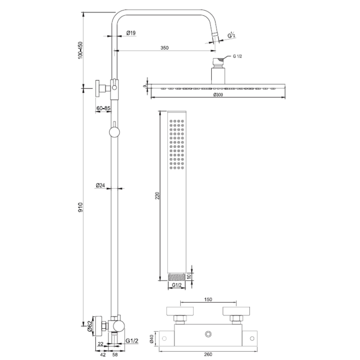 Deze set bestaat uit een complete opbouw regendoucheset met thermostaatkraan, staaf handdouche en regendouche van 30 cm. De thermostaatkraan is eenvoudig te bedienen. Met de linkerdraaiknop bepaalt u de gewenste douchestand en daarmee wisselt u tussen hoofd- en handdouche. Met de rechter draaiknop stelt u de gewenste watertemperatuur in. Deze knop is voorzien van temperatuurblokkering bij 38°C, zodat de kraan voor iedereen veilig te gebruiken is. De glijstang is verstelbaar tussen 95 en 140 cm