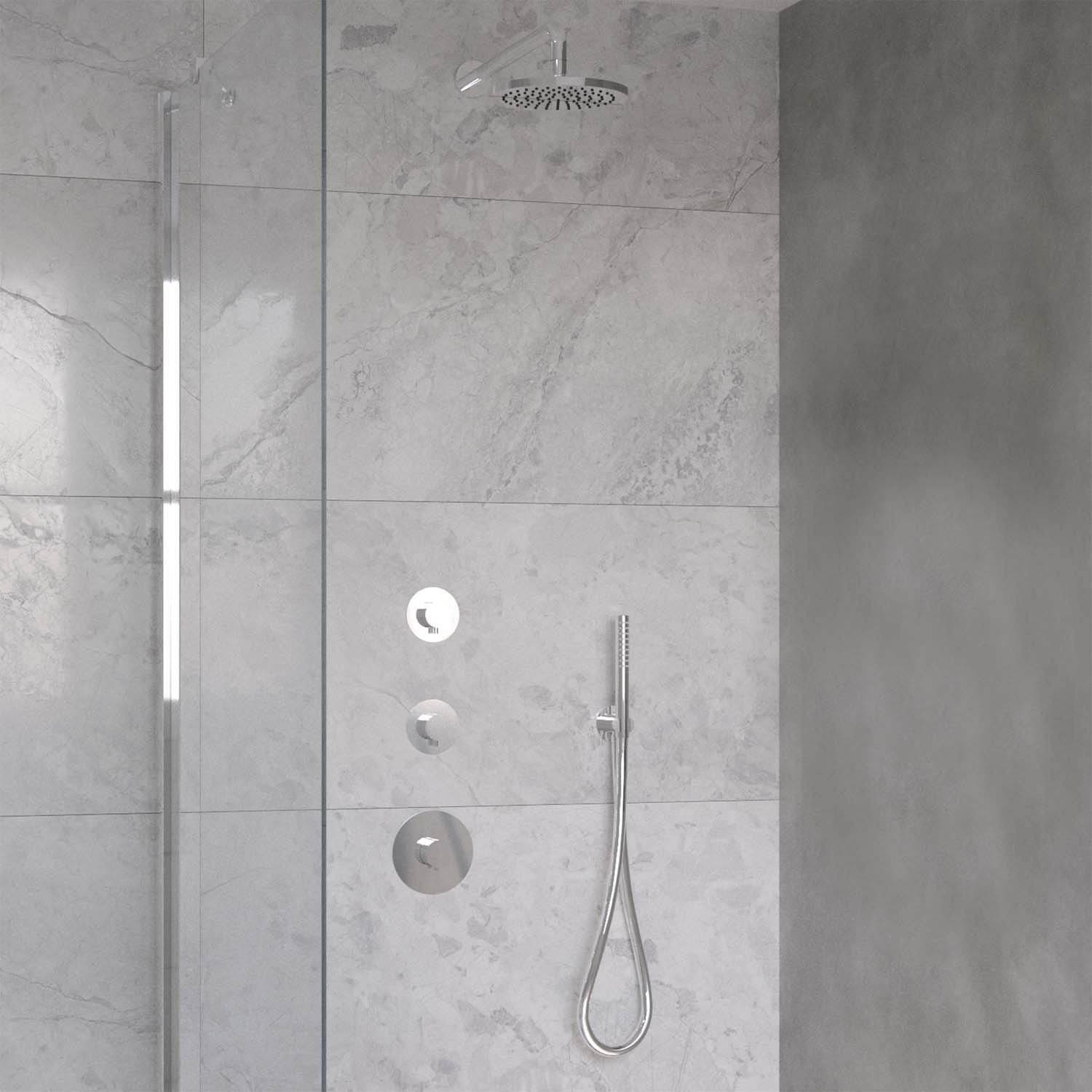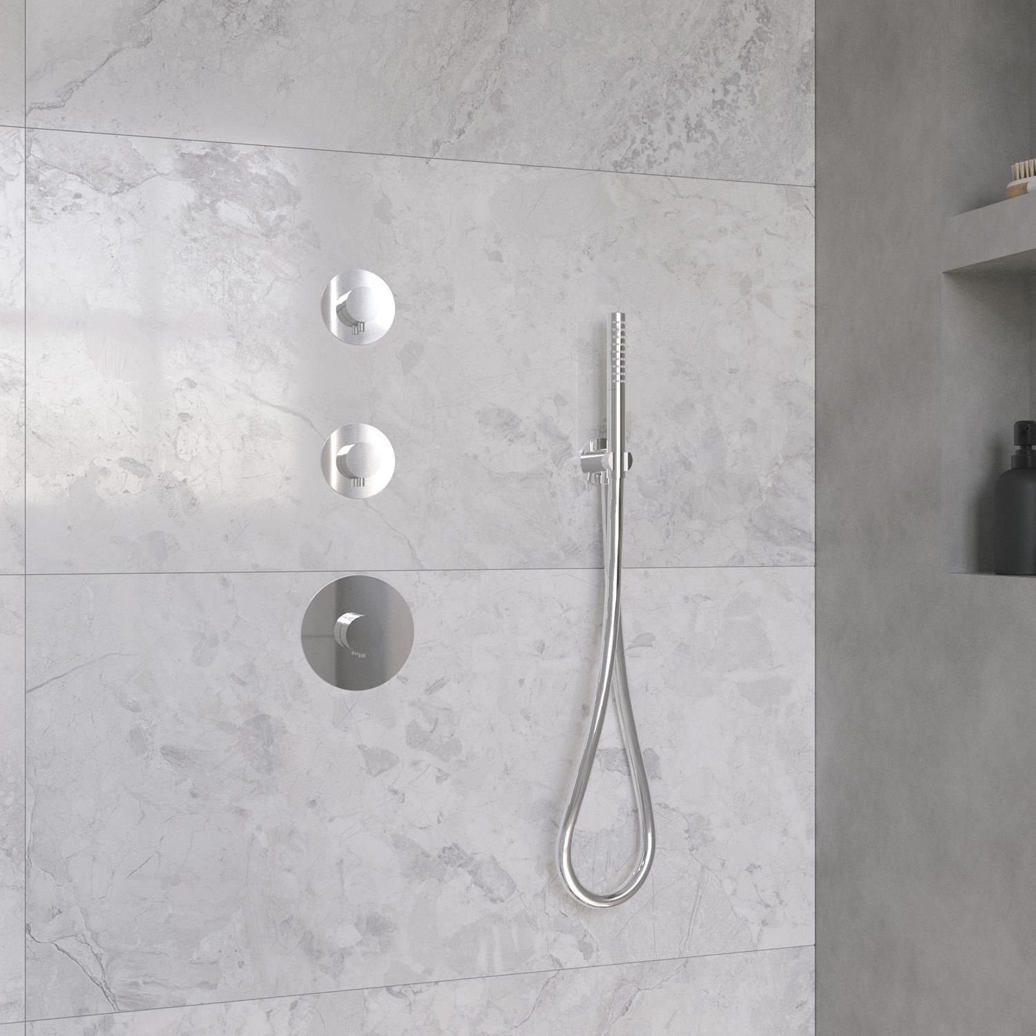 De set wordt geleverd met thermostatische douchekraan, 2 stopkranen, een regendouchekop met bijpassende wanduitloop, muuruitlaat, doucheslang en handdouche. Daarnaast heeft u de optie een alternatieve douchekop, handdouche, wanduitloop en wanduitlaat te kiezen, eventueel voor een meerprijs.