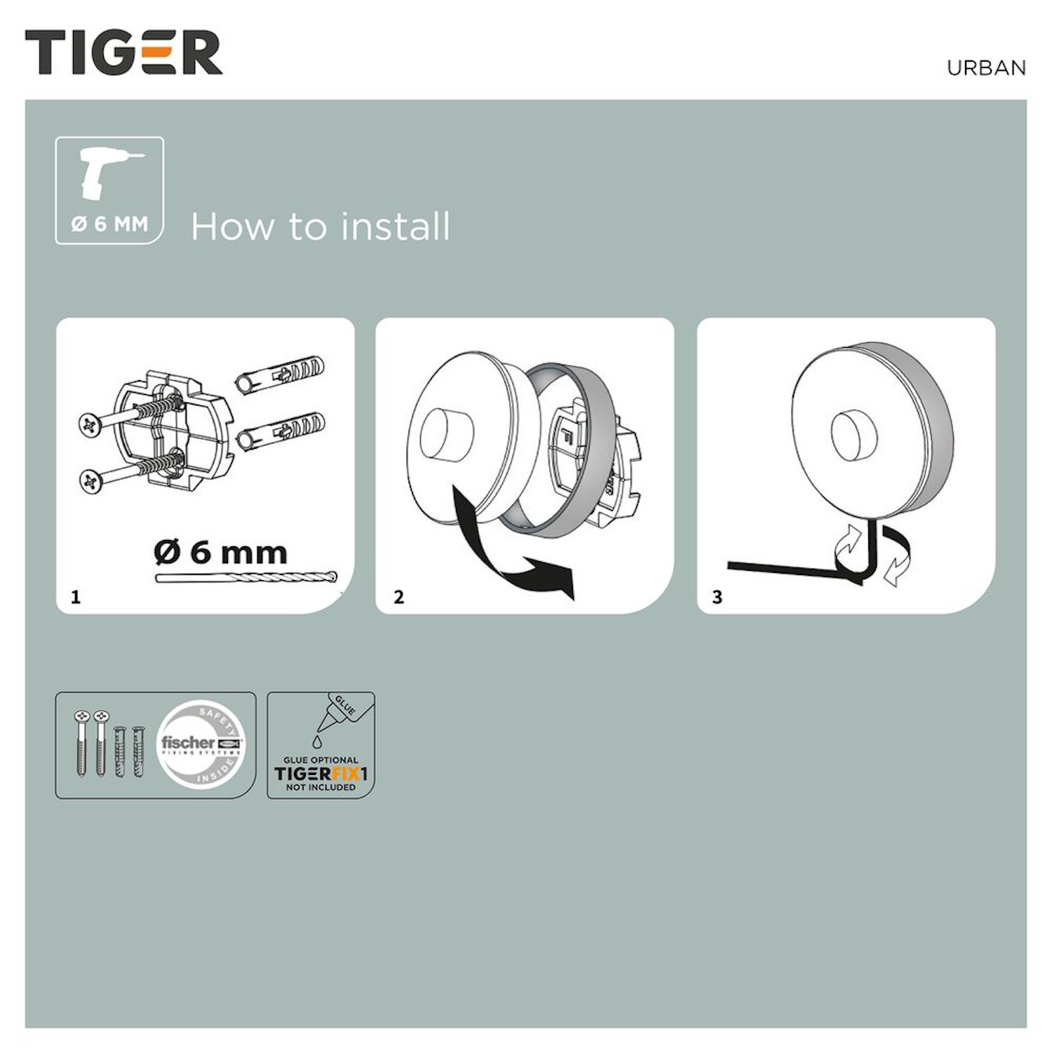 De Urban reserverolhouder is ook geschikt voor montage met TigerFix type 1, waarmee accessoires snel en eenvoudig op een gladde, harde ondergrond te bevestigen zijn door middel van een gepatenteerd lijmsysteem. Boren is niet noodzakelijk en de accessoires zijn eenvoudig te verwijderen zonder dat er resten op de ondergrond achterblijven.