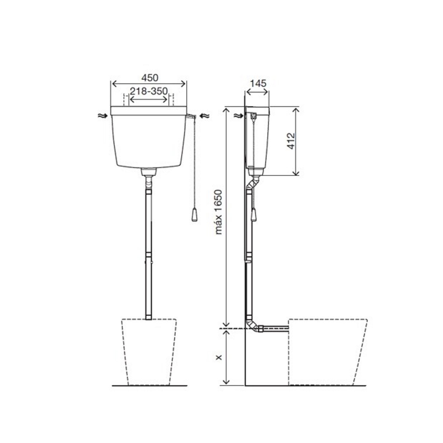 Dit hooghangend kunststof reservoir in wit kan direct aan de muur bevestigd worden boven het toilet en wordt bediend met een closettrekker. Het reservoir heeft een inhoud van 9 liter maar kan, indien gewenst, ook aangepast worden naar 6 liter en wordt geleverd inclusief muurbevestigingsmateriaal, 4 modulaire valpijpen met een diameter van 32 mm en een rubber ring voor aansluiting op de toiletpot.