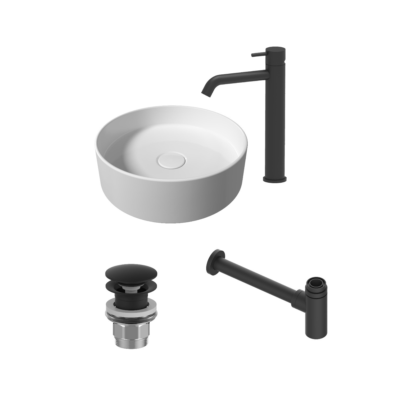 U heeft in deze set keuze uit maar liefst zes kleuren waskommen en uit vier kleuren wastafelkranen, clickwastes en sifons. In de wastafel zit geen overloop verwerkt. Er wordt een bijpassende afvoerplug bij geleverd in dezelfde kleur als het keramiek. U kunt in deze set er ook voor kiezen om tegen een meerprijs een clickwaste toe te voegen in dezelfde kleur als uw gekozen kraan en sifon.