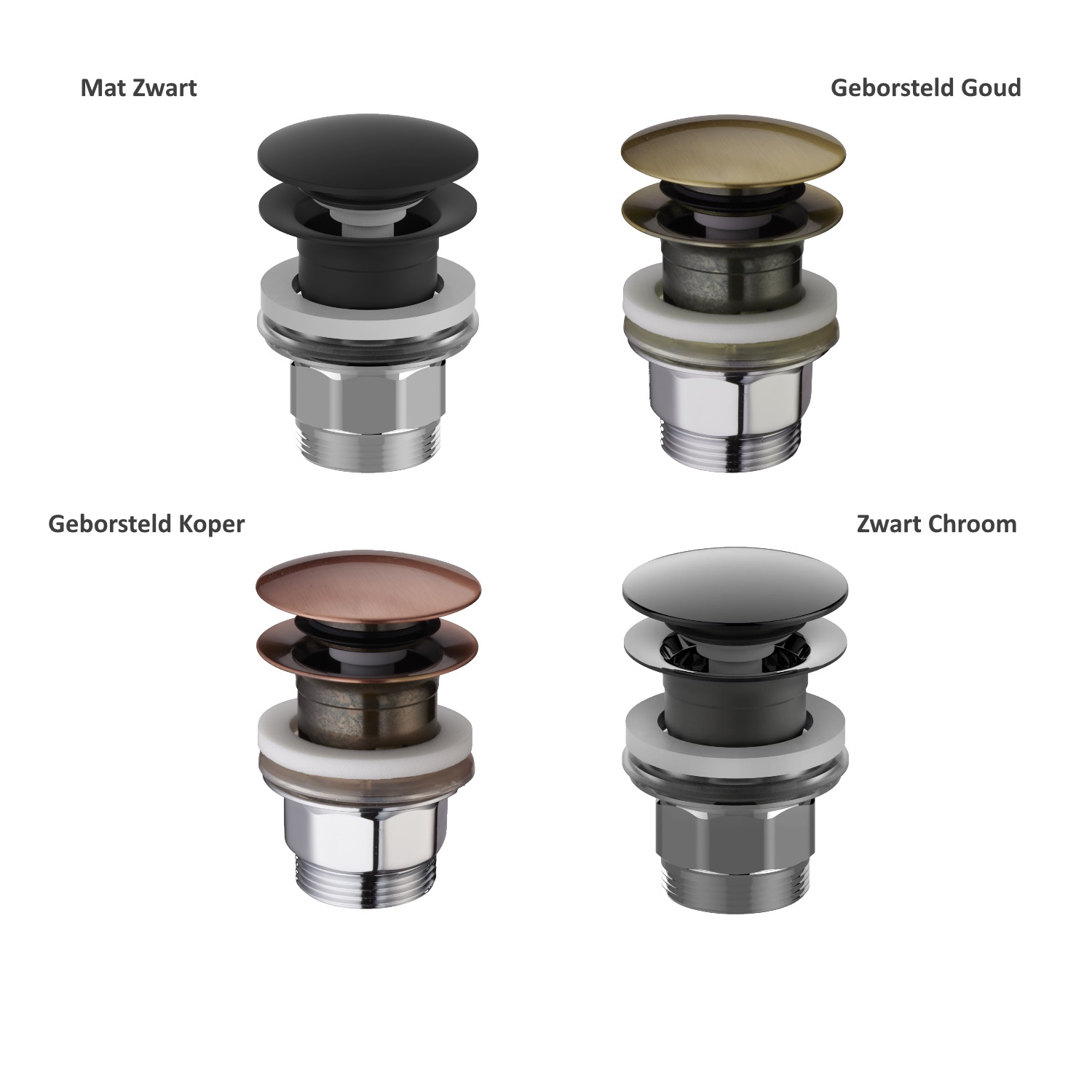 U heeft in deze set keuze uit maar liefst vier kleuren wastafelkranen, clickwastes en sifons. In de wastafel zit geen overloop verwerkt. Er wordt een bijpassende afvoerplug bij geleverd in dezelfde kleur als het keramiek. U kunt in deze set er ook voor kiezen om tegen een meerprijs een clickwaste toe te voegen in dezelfde kleur als uw gekozen kraan en sifon.