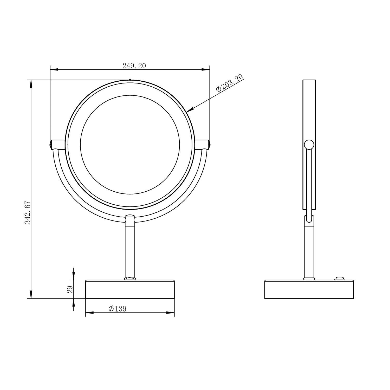 De diameter van de BWS spiegel is 20 cm en de LED-verlichting geeft warm licht (3000K). De spiegel werkt op batterijen en heeft een aan-uitschakelaar op de voet van de lamp.