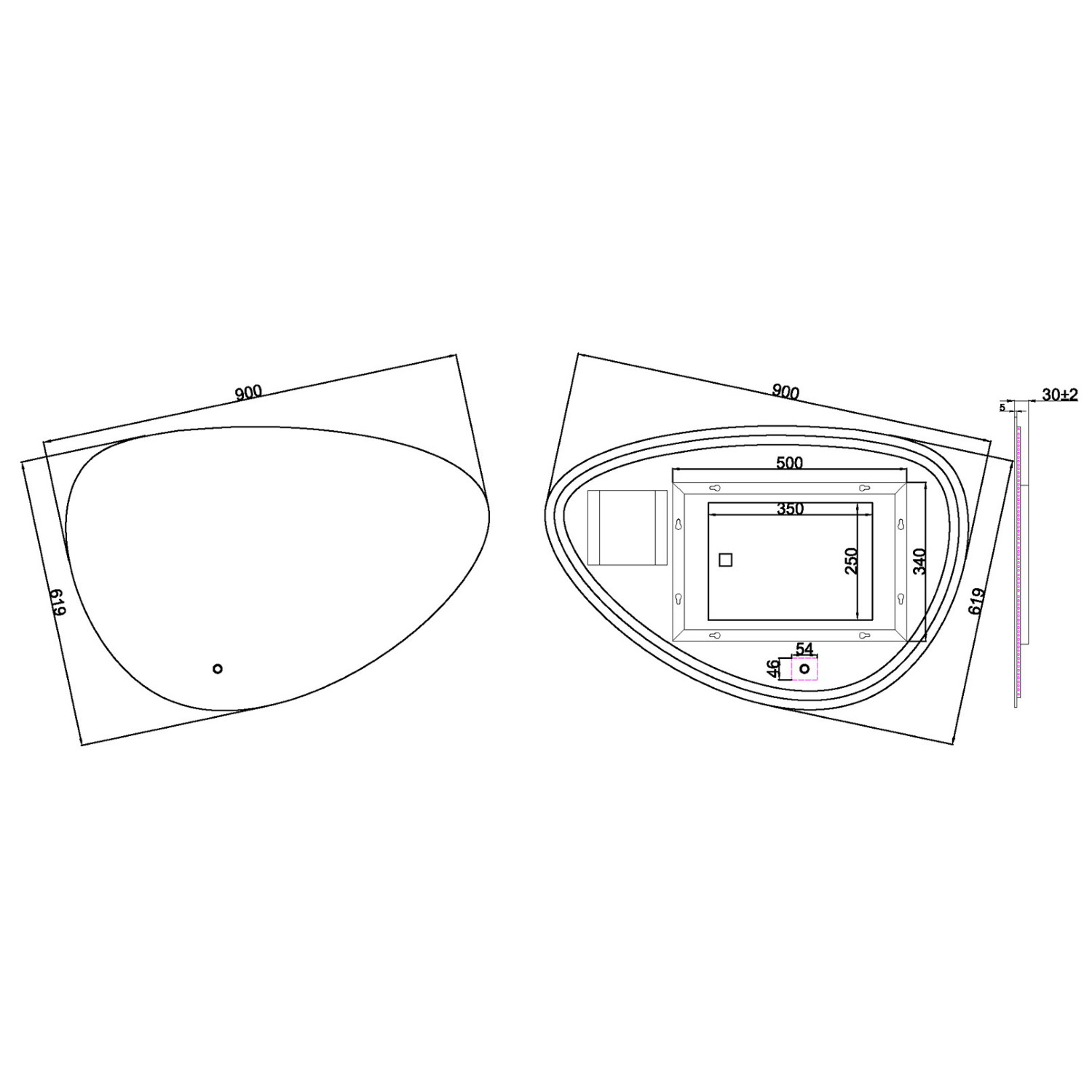 De badkamerspiegel heeft een unieke organische vorm en heeft een breedte van 90 cm.