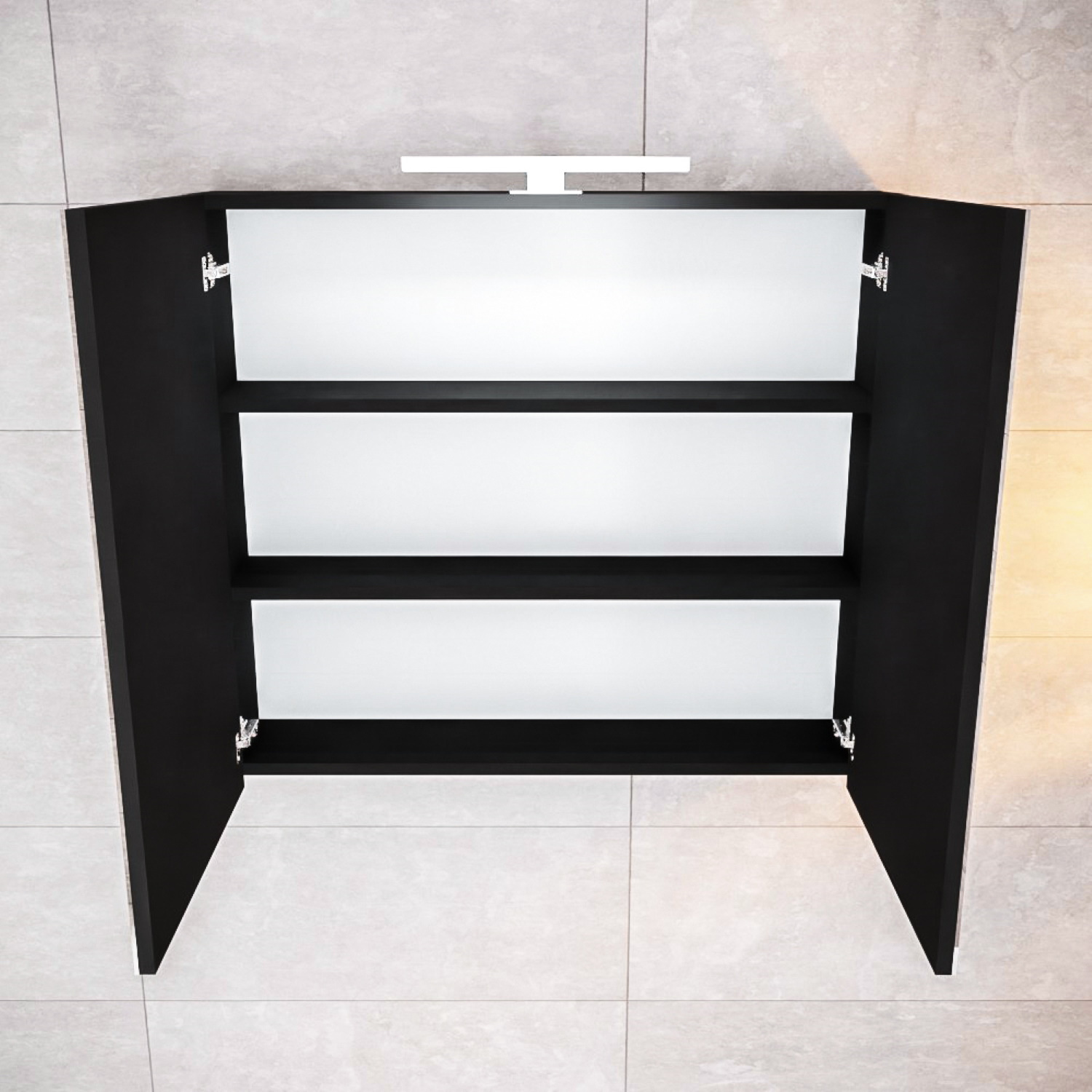 Deze 'Cube' spiegelkast van het merk Boss & Wessing is een absolute aanwinst voor uw badkamer. De fraaie kast heeft een breedte van 80 cm, een hoogte van 70 cm en een diepte van 16 cm. Rondom is de kast afgewerkt in een mat zwarte kleur. De spiegelkast is voorzien van twee deurtjes, met daarachter meer dan genoeg opbergruimte voor diverse badkamerartikelen. Binnenin is de Cube uitgerust met drie legplanken die voldoende opbergruimte creëren.