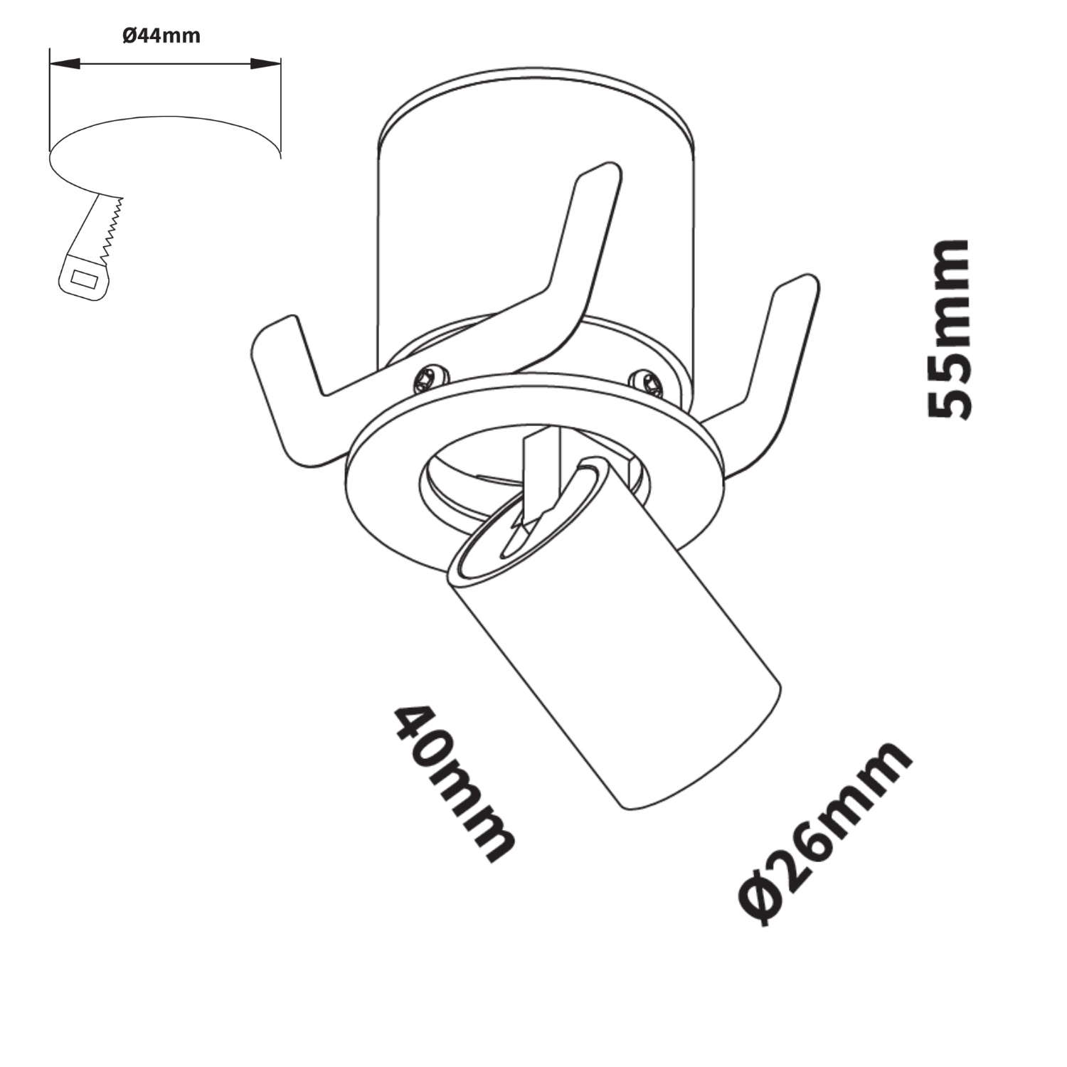 Het inbouwdeel van het spotje is 5.5 cm hoog. Het spotje zelf is 4 cm lang. De doorsnee is 2.6 cm. Daarnaast wordt er 3 jaar garantie gegeven op dit product en is het aantal lichturen ongeveer 30.000.