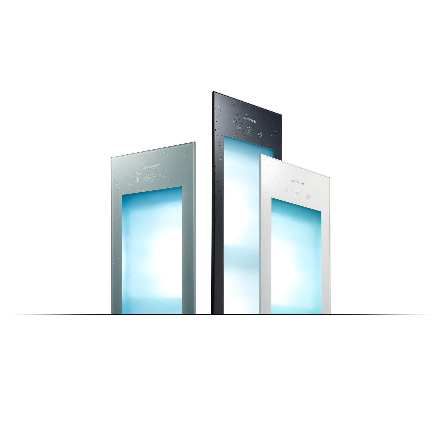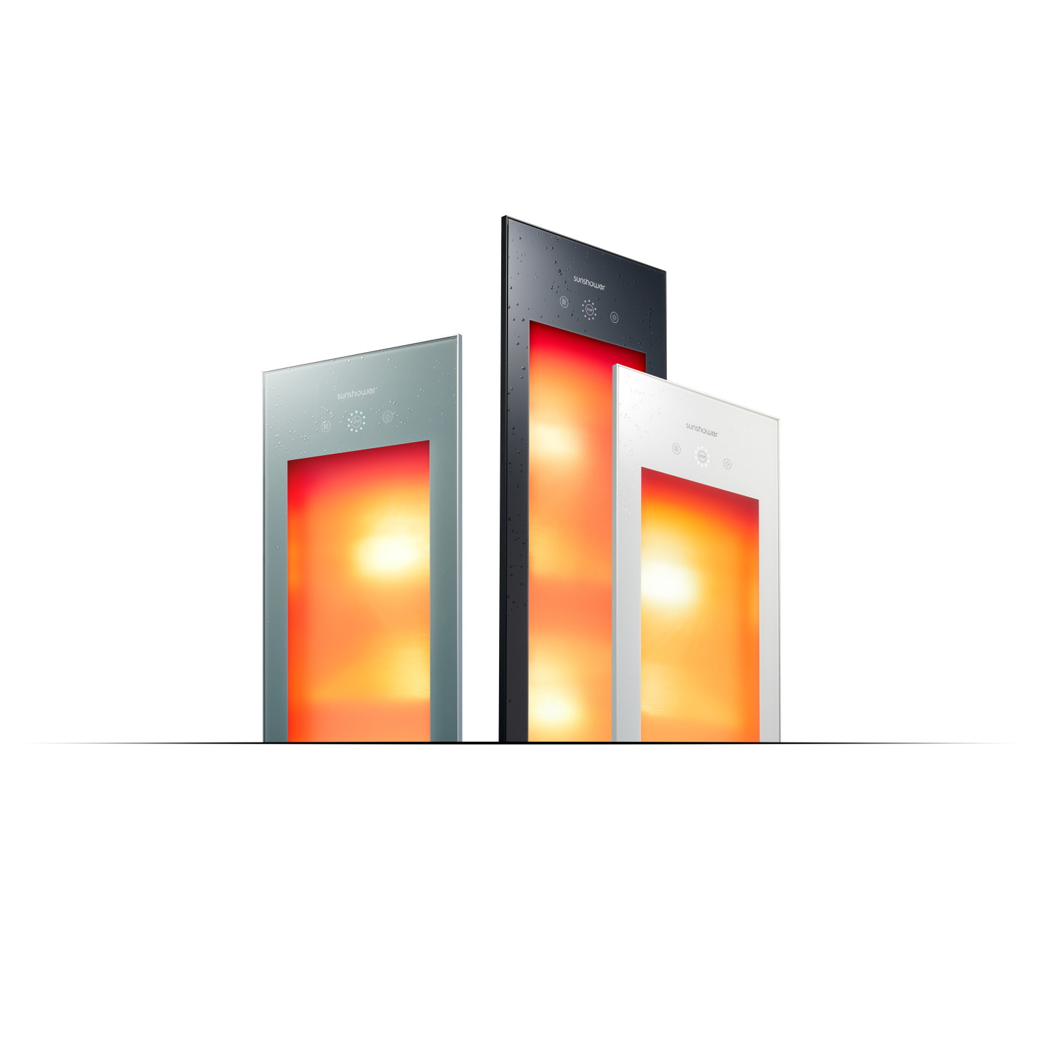 Design: De Sunshower Deluxe Organic grey is een full body inbouwapparaat met zowel een UV- als infraroodfunctie. De Sunshower Deluxe Organic Grey heeft vijf kortegolf infraroodlampen van elk 500W en vier UV-lampen. Het apparaat is afgewerkt met een gezandstraalde glasplaat met een wit kader en heeft een smalle opstaande aluminium rand.