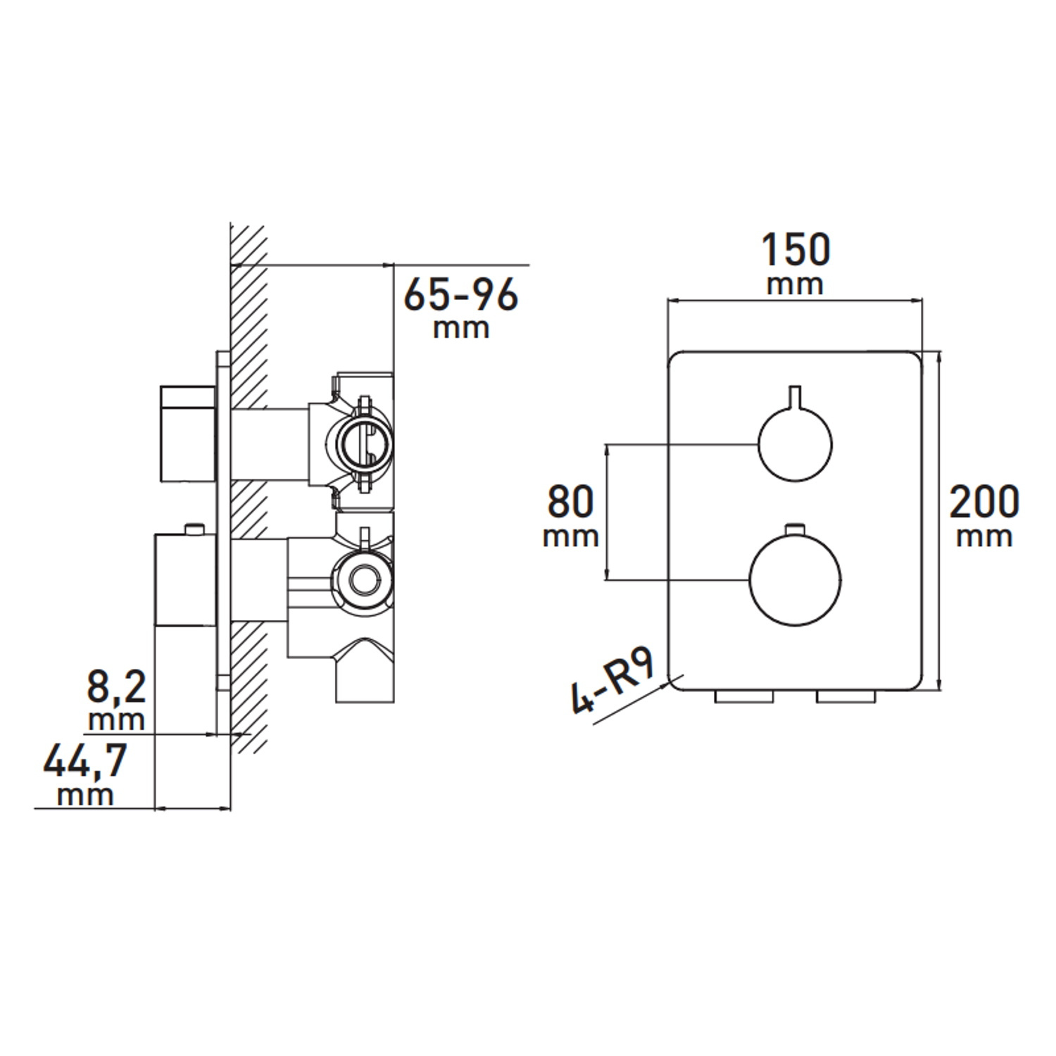 De douchekraan hoogte van 20 cm, breedte is 15 cm en een diepte van 0,82 cm. De inbouwdiepte van het inbouwdeel is variabel van 6.5 tot 9.6 cm.