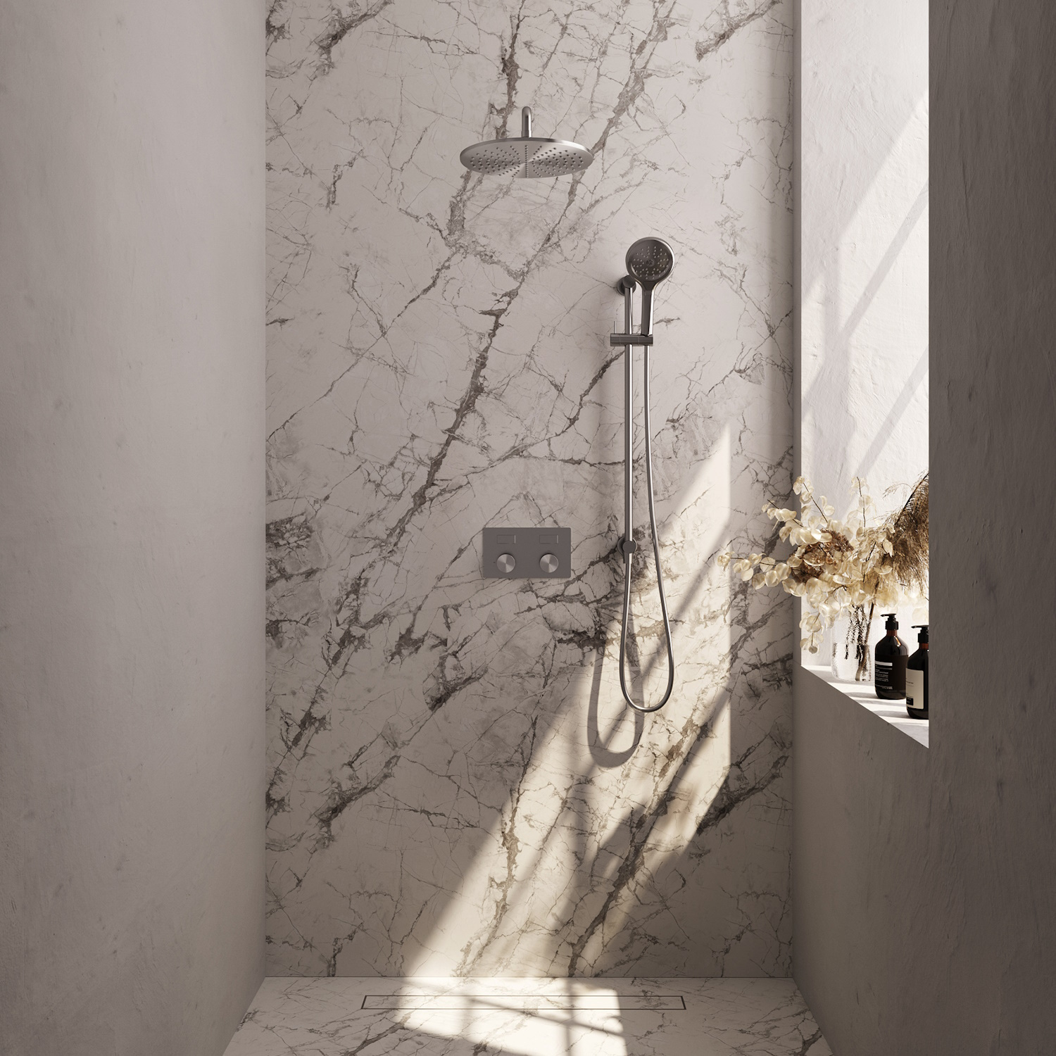 Dit artikel bestaat uit een thermostatische inbouw regendouche met drukknoppen, douchekop met een diameter van 30cm, een gebogen muurarm en 3-standen handdouche en doucheslang en geintegreerde glijstang.