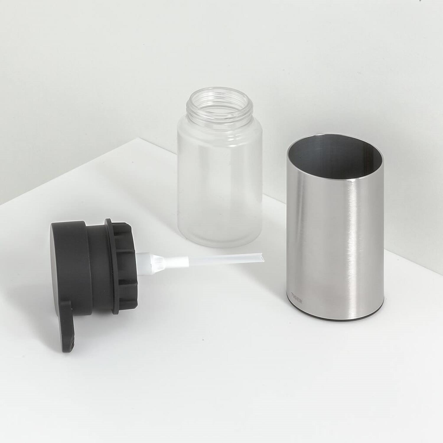 Deze vrijstaande zeepdispenser van de Noon serie van Tiger, wordt geleverd in de kleur RVS en heeft een geborstelde afwerking. Met zijn geborstelde afwerking haalt u een uniek product in huis, omdat elk product met een geborstelde afwerking er anders uit ziet. De dispenser is voorzien van een uitneembaar, kunststof zeepreservoir met een inhoud van 135 ml, waardoor het product gemakkelijk is te vullen met vloeibare zeep.