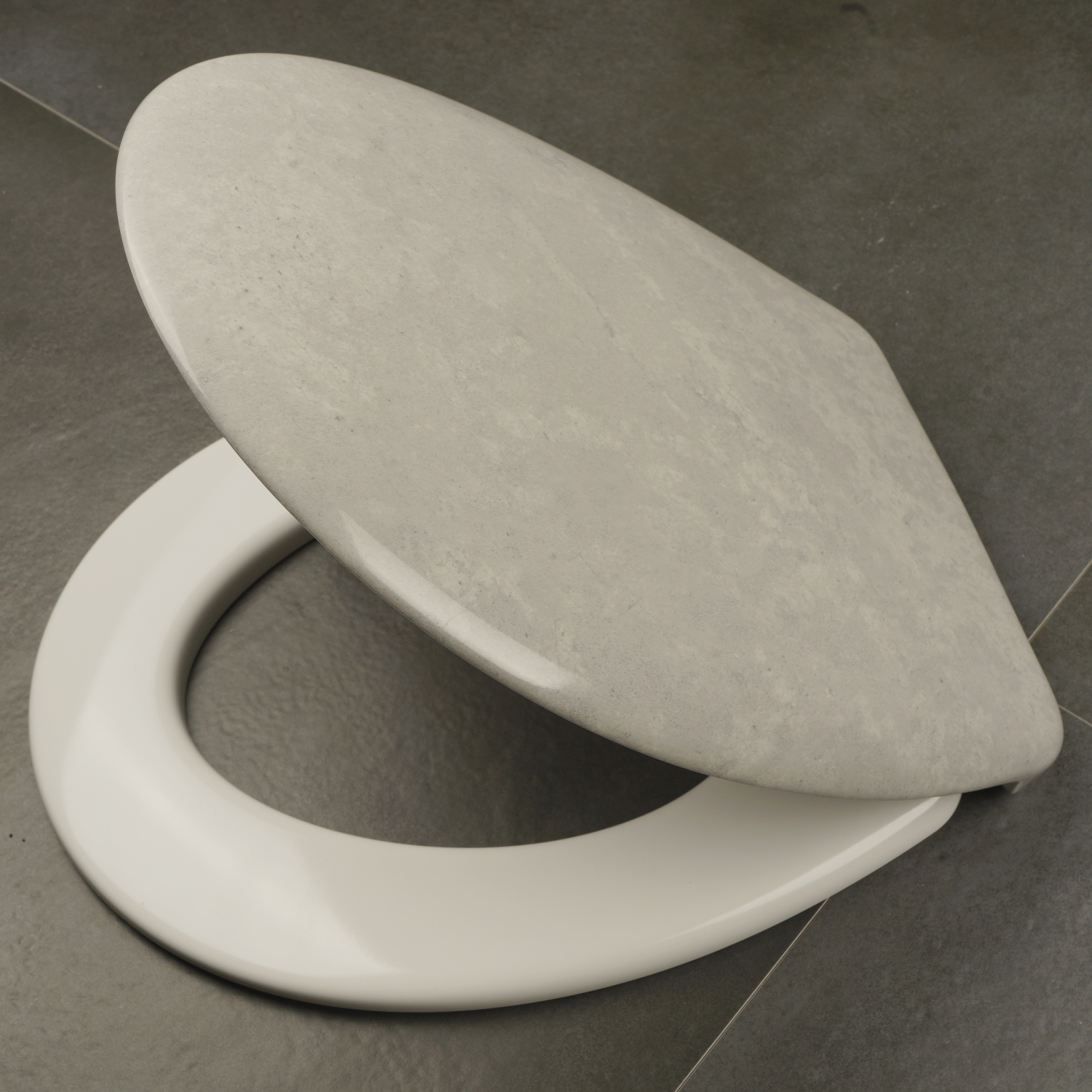 Deze toiletzitting is een echte eyecatcher door zijn deksel met betonlook. De toiletbril is wit en is gemaakt van duroplast. Dat is een krasvast materiaal, wat lang meegaat en makkelijk schoon te maken is. Omdat duroplast geen poriën heeft, hecht er geen vuil aan.