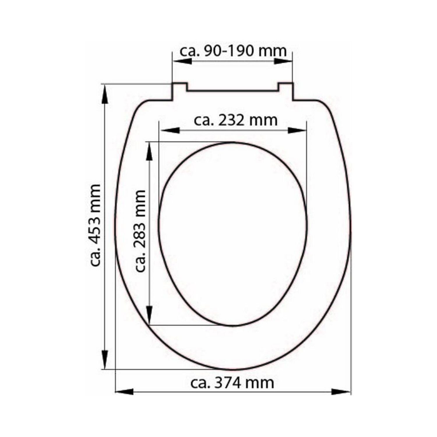 De toiletzitting past op iedere gangbare toiletpot. De afmetingen zijn; breedte 37.4 cm x diepte 45.3 cm x hoogte 5 cm.