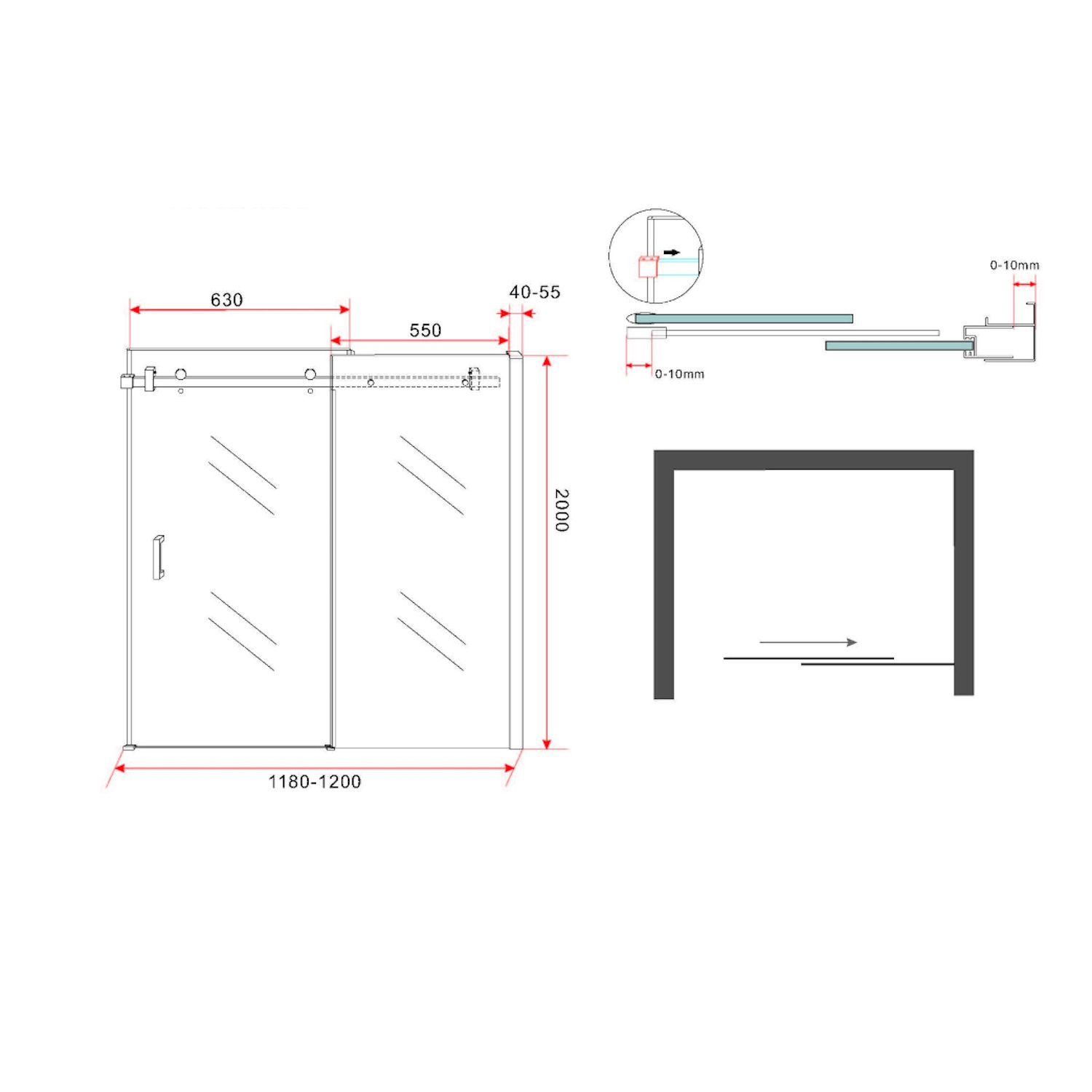 De vaste wand heeft aan de onderzijde een deur geleider, zodat de schuifdeur stabiel blijft. De geleidestang van de nisdeur is inkortbaar waardoor deze in een nis geplaatst kan worden vanaf 117 tot 120 cm.