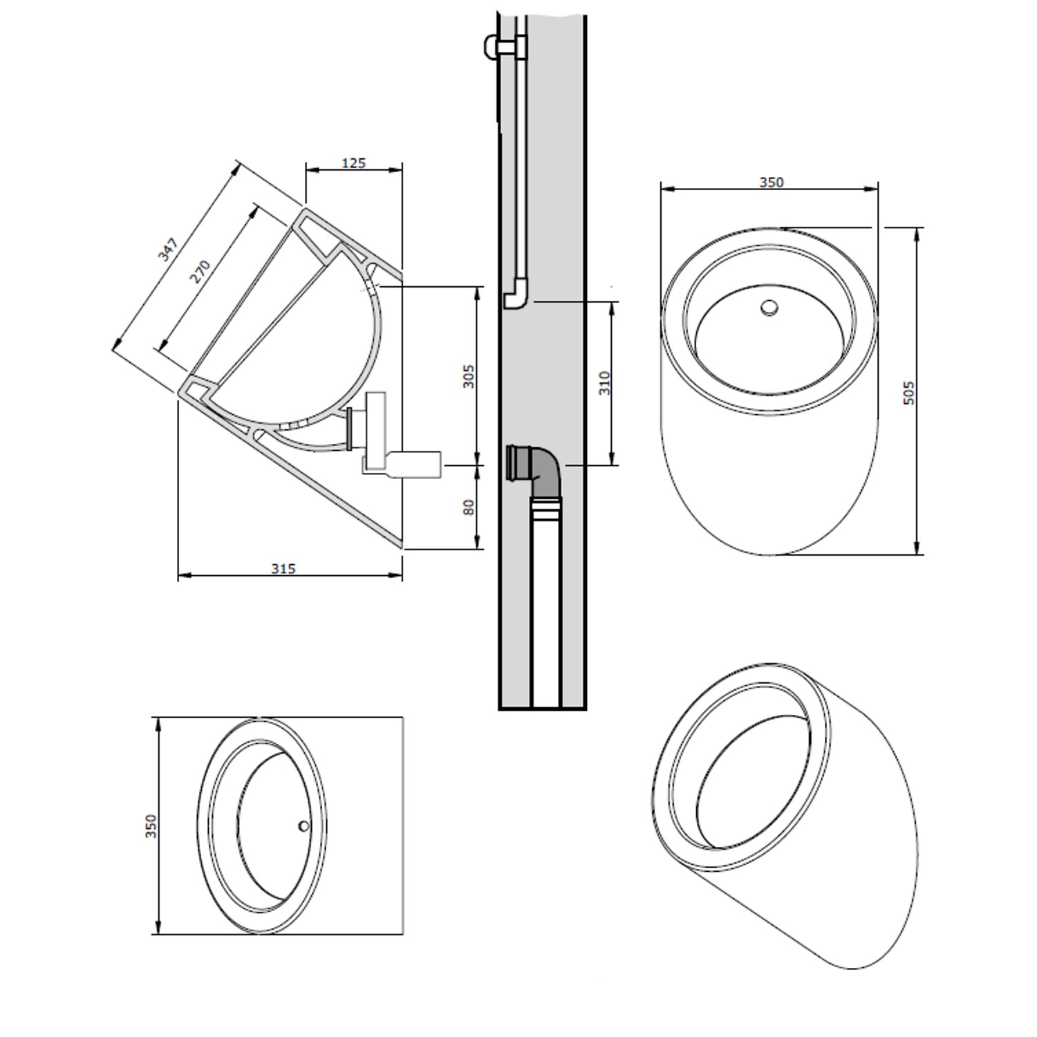 Het urinoir is 50,5 cm hoog en 35 cm breed. De diepte is 31,5 cm. Hij is van keramiek in de kleur wit.