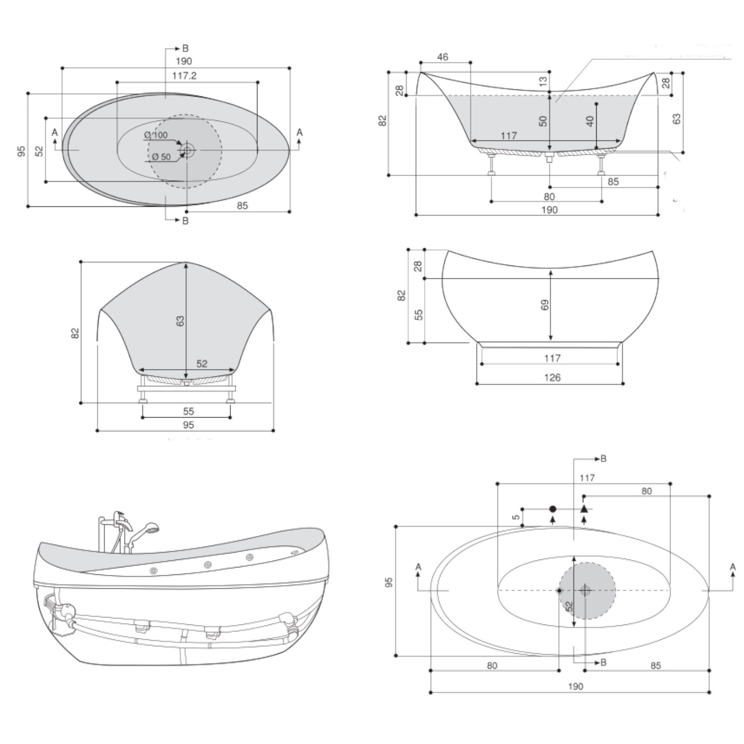 Het bad heeft een lengte van 190 cm, een breedte van 96 cm hoogte van 82 cm en is verkrijgbaar in een Wite kleur.