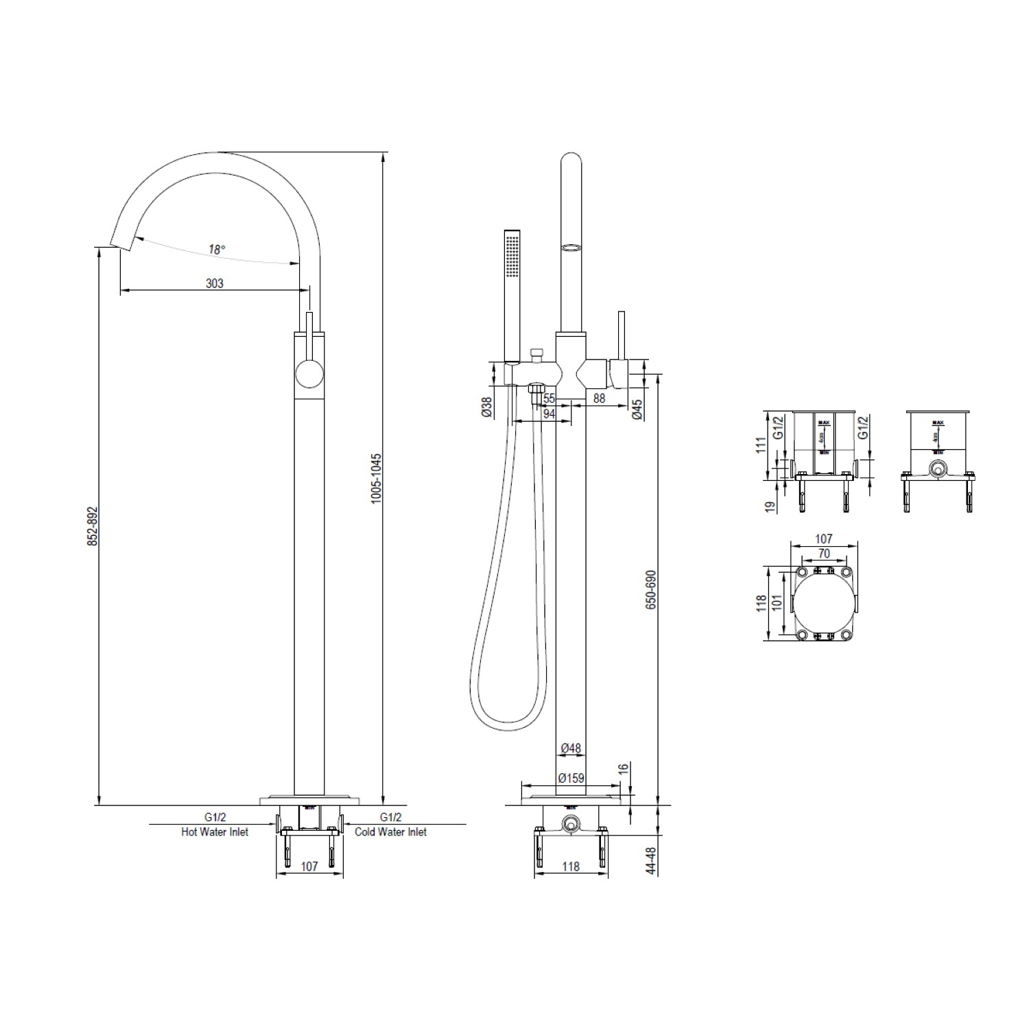 De Brauer vrijstaande badkraan heeft een hoogte van 100,5 cm. Bovendien is de kraan in hoogte verstelbaar tot en met 104,5 cm. De hoogte van de uitloop is 85,2 cm en deze heeft eveneens een verstelbaarheid van 4 cm omhoog tot en met 89,2 cm. De badkraan heeft een 1/2''-aansluiting en een uitloop lengte van 30,3 cm.