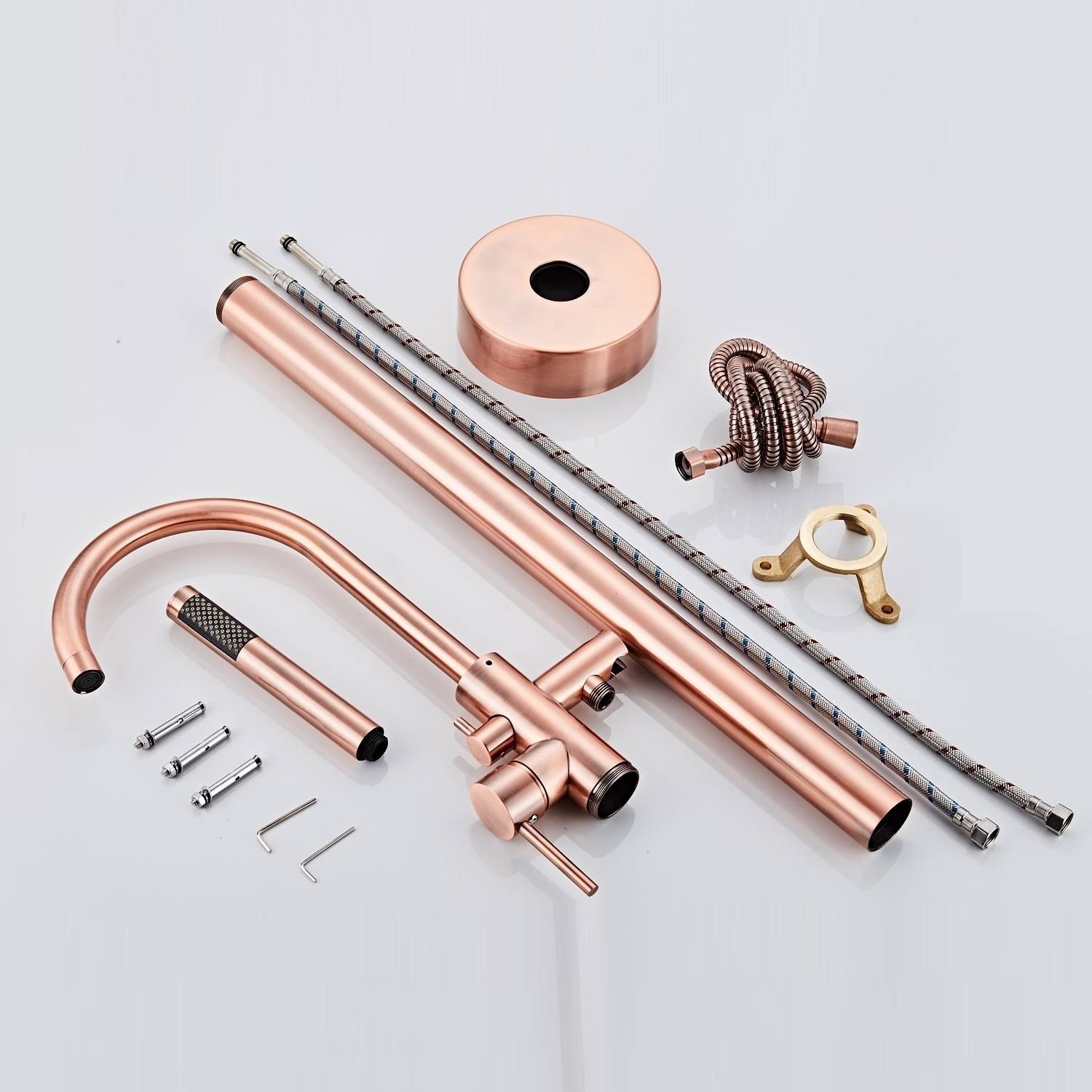 Bij een vrijstaande badkraan hoort een handdouche. Deze is, net als de badkraan, gemaakt van messing. Een stevig materiaal wat zeer goed in natte ruimtes gebruikt kan worden. De handdouche vorm is gelijk als de vorm van de badkraan, zeer elegant en stijlvol. De handdouche is voorzien van siliconen sproeigaatjes. Deze zijn eenvoudig te ontkalken.