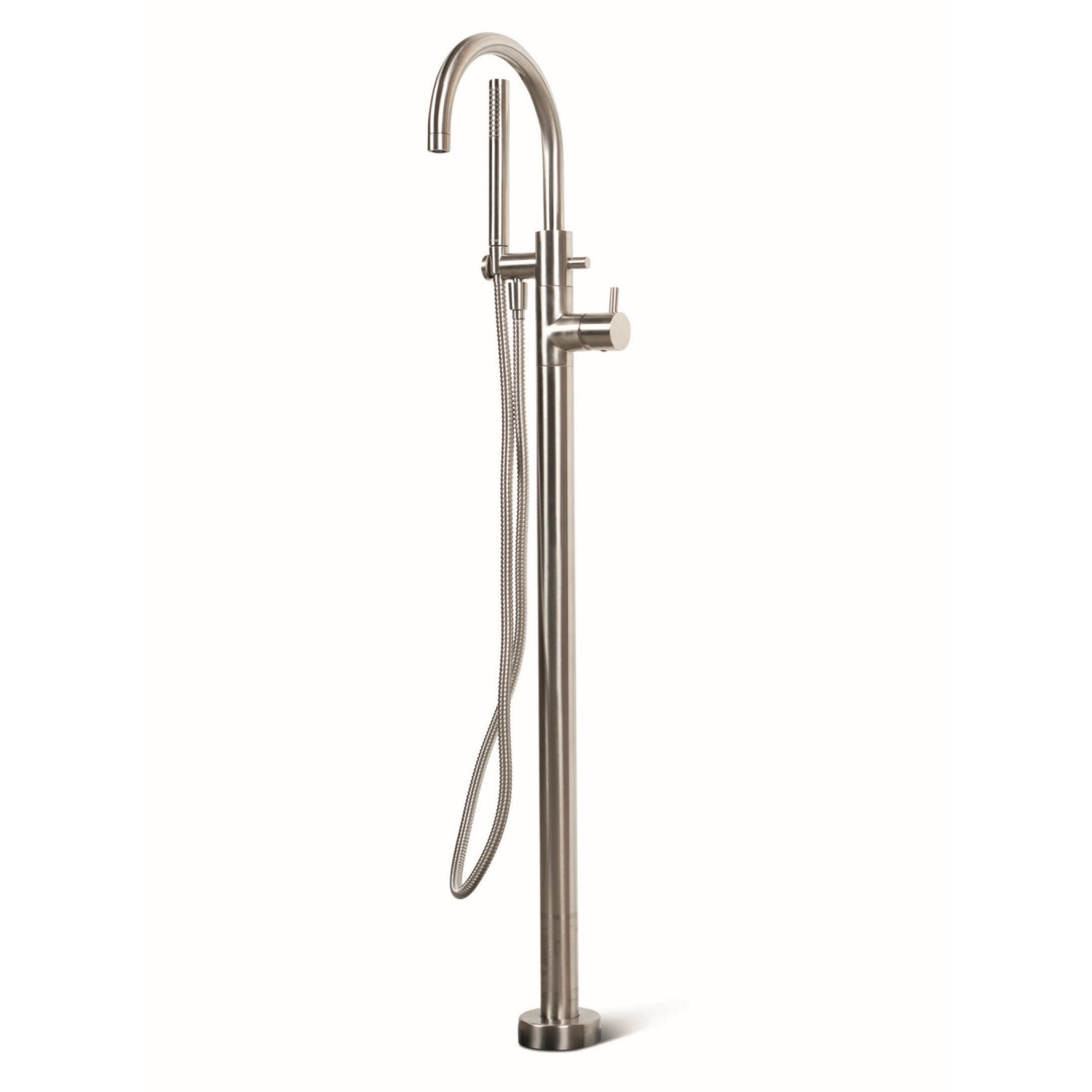 De badkraan heeft een hoogte van 113 cm. de uitloop is 21 cm lang. De bijgeleverde handdouche is 18,5 cm lang. De set is van messing in de kleur RVS. Het design is een tikkeltje modern, maar vooral tijdloos. Zo kan hij bij iedere stijl worden toegepast.